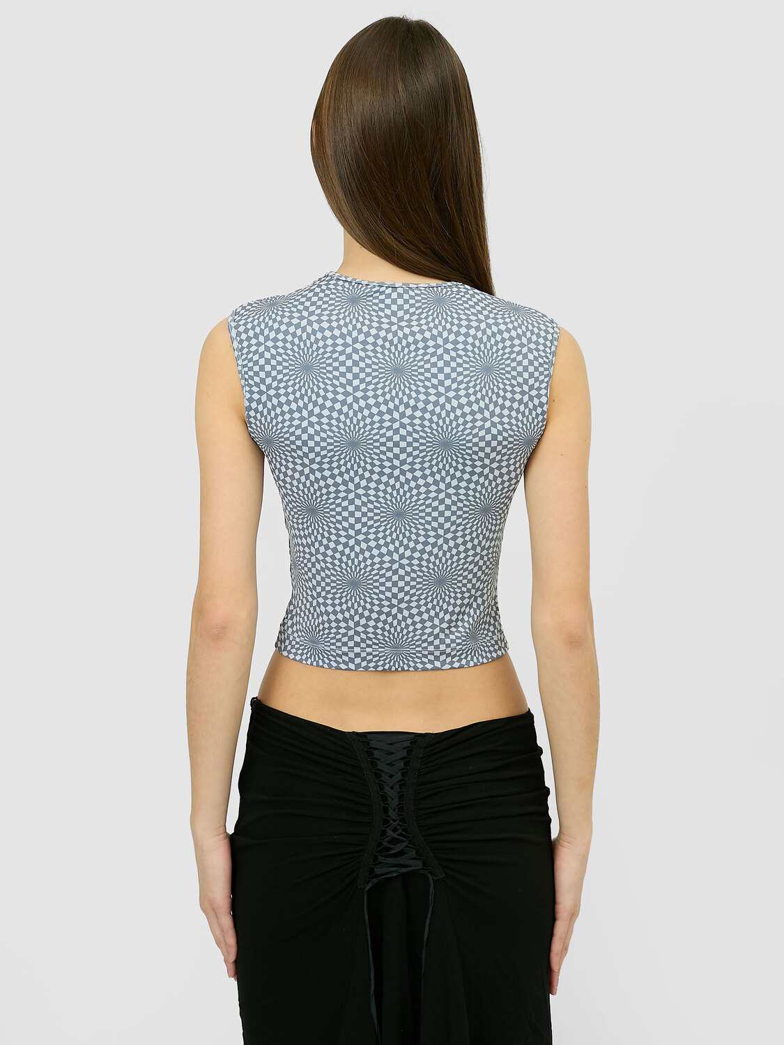 Plein Sud blue and slate stretchy nylon sleeveless top with a geometrical optical illusion pattern print.