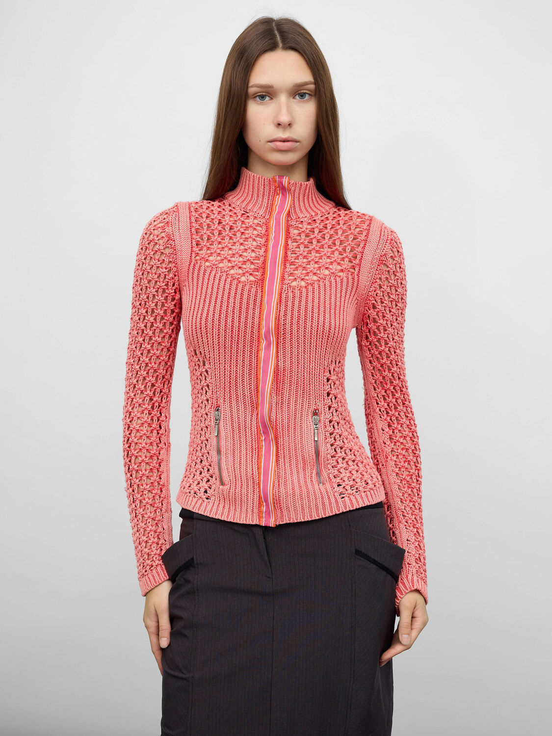 Coral pink acid wash knitted zip-up jumper. Two front pockets with zipper closure.