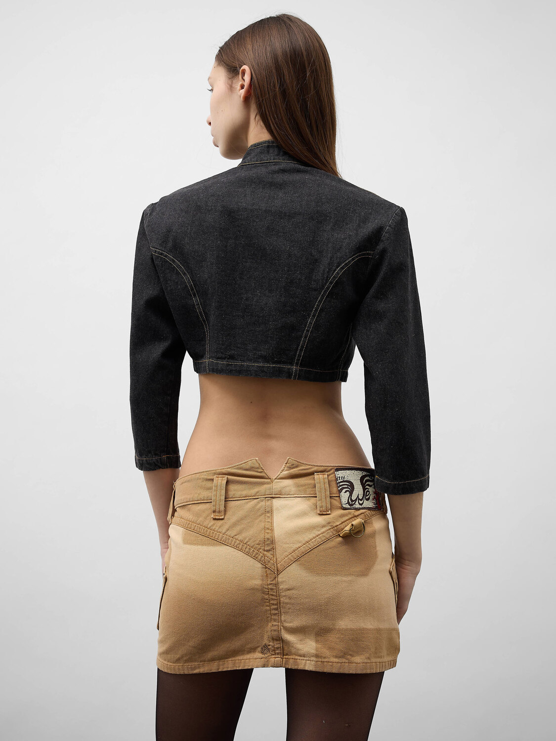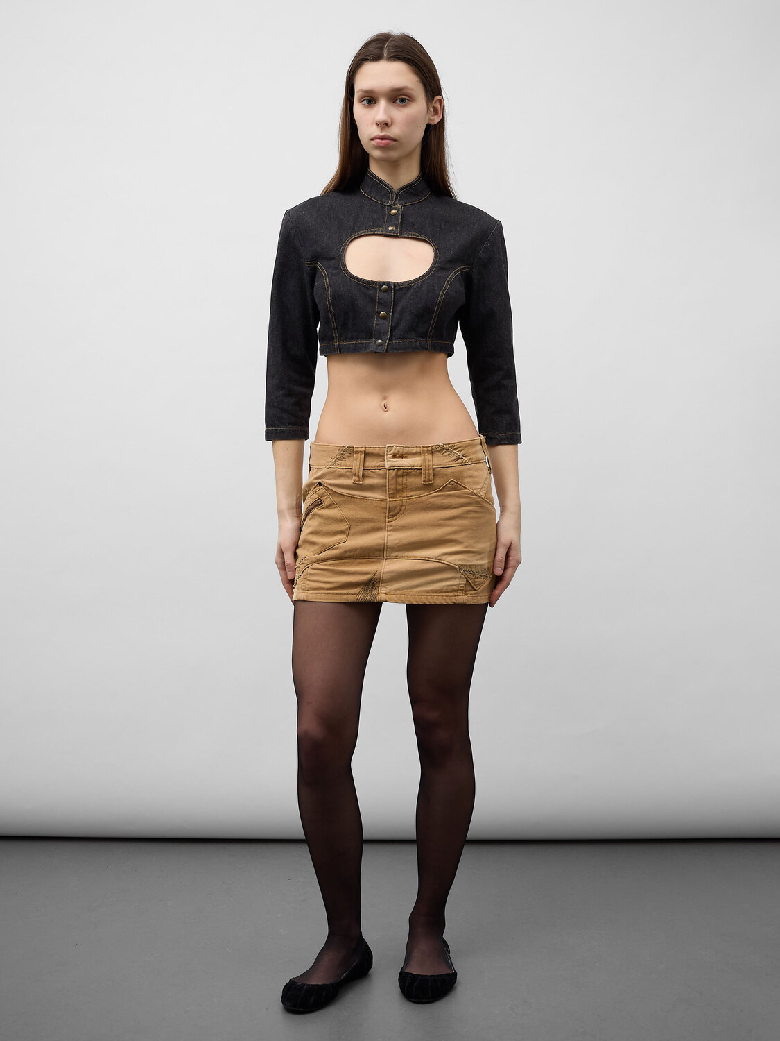 Dark grey denim crop top with cutout detail and snap button closure.