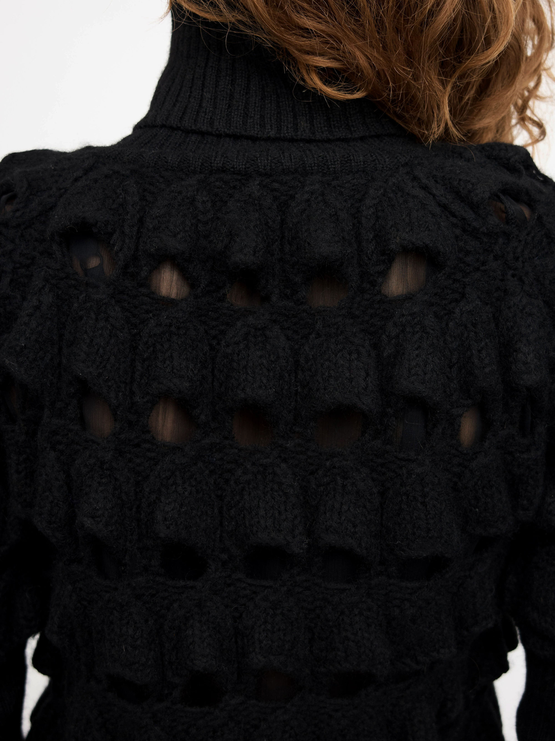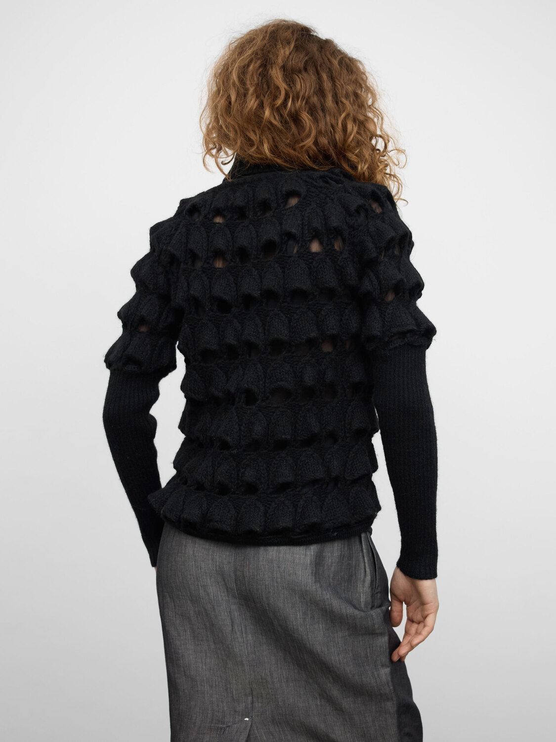 Extē black 3D knitted zip-up cardigan with cutout details and mesh lining.