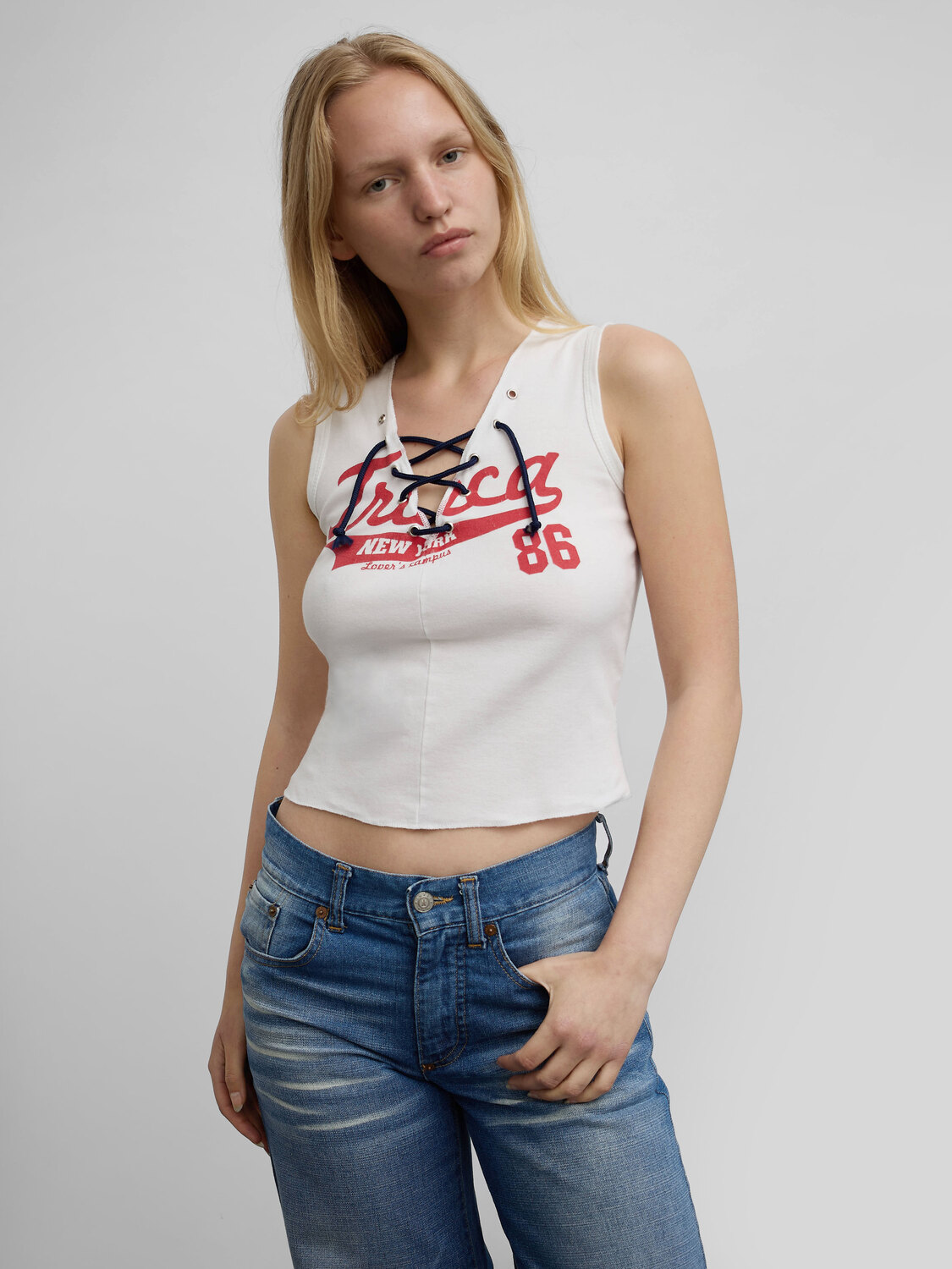 Tribeca white cotton tank top with a red Tribeca New York print and lace-up detail at the front.
