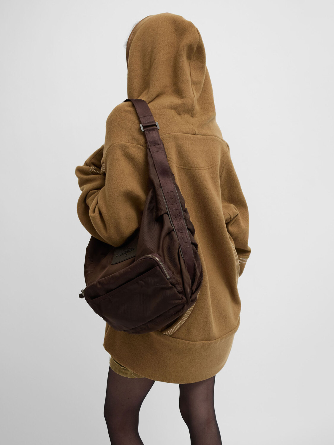 Diesel brown nylon shoulder bag. Leather trims. Logo strap that loops around the base. Gathered detail on the sides. Front pocket with zipper closure.