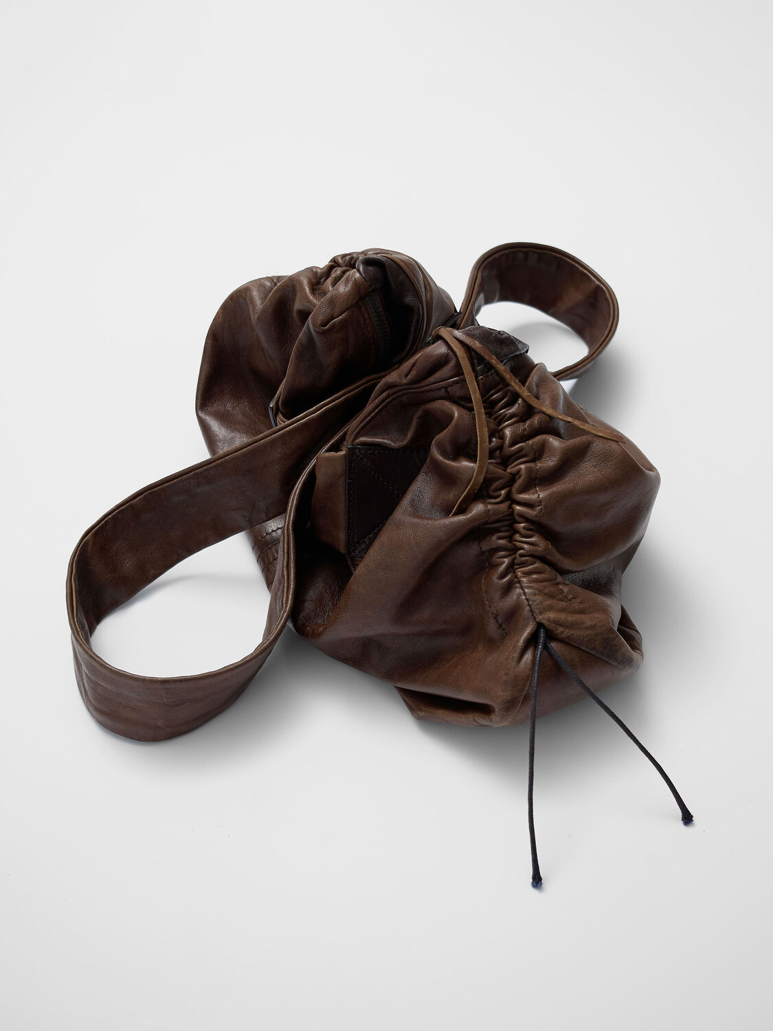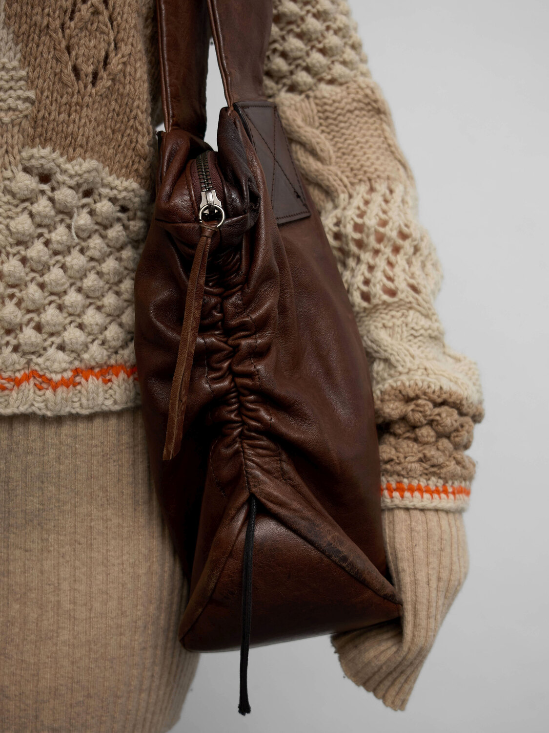 Brown leather handbag with gathered sides and zipper closure. One interior zip pocket and brown textile lining.