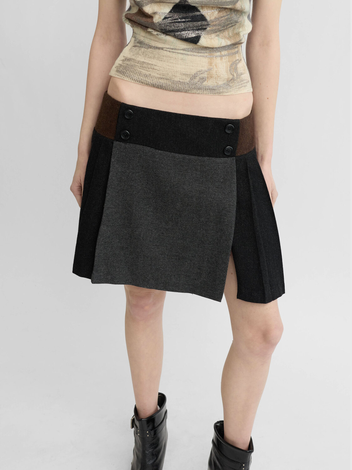 Extē brown, grey and black wool patchwork mini skirt. Pleated details. Concealed side zipper closure.