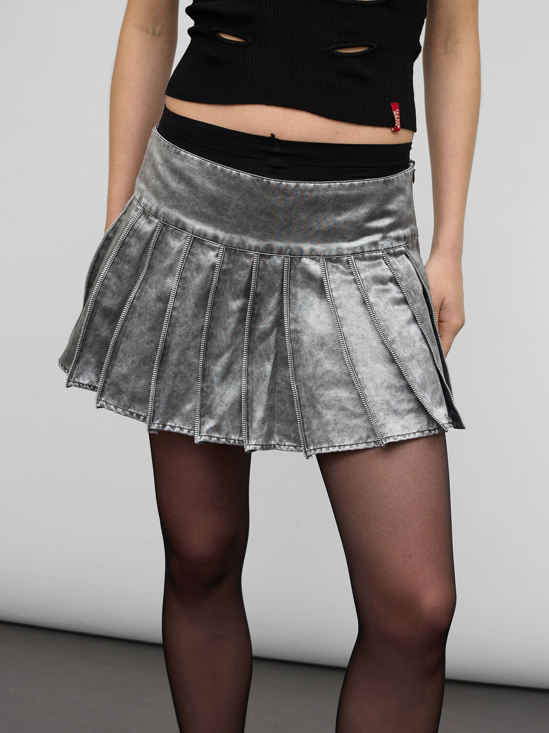 Silver grey heavy satin pleated low-rise mini skirt with decorative silver-tone metal zippers.