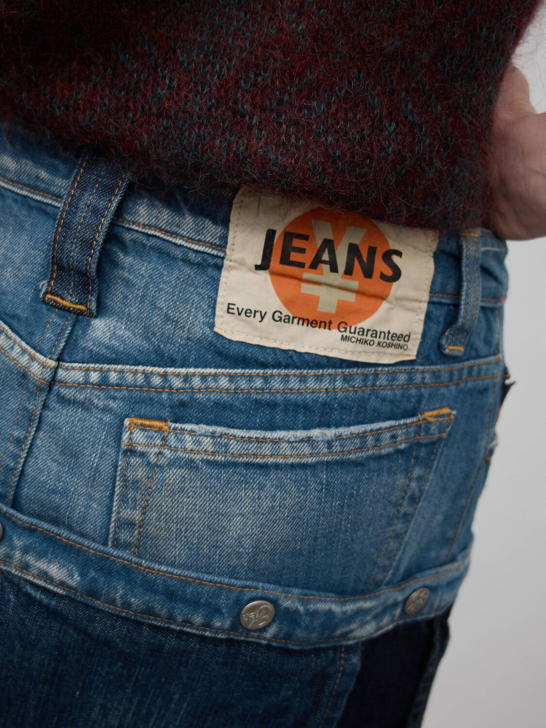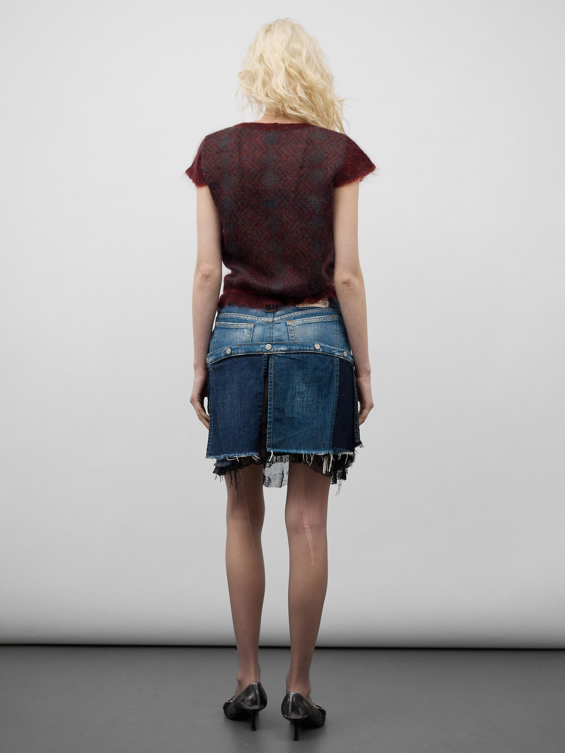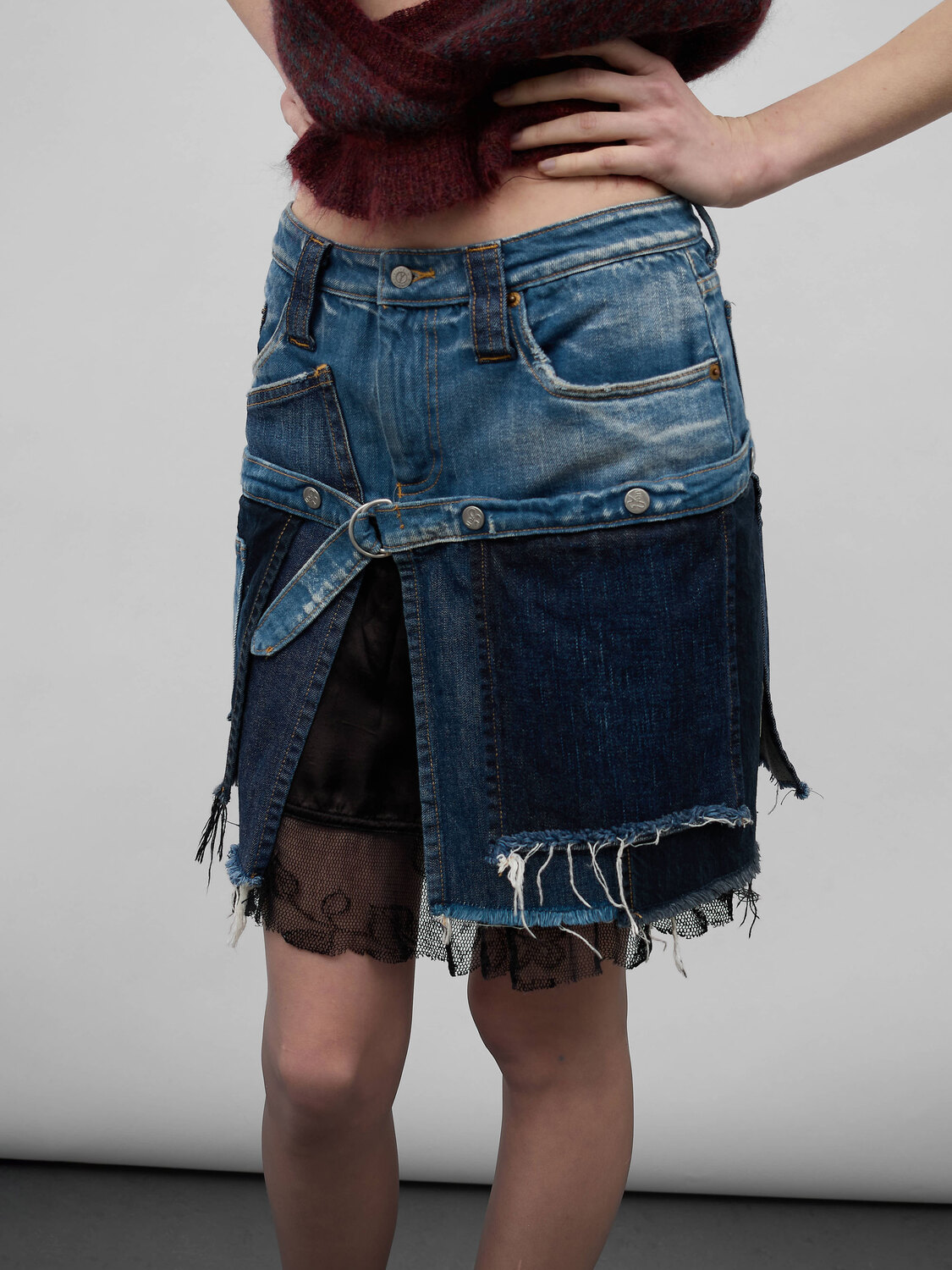 Michiko Koshino (Yen Jeans) deconstructed skirt in multiple shades of denim featuring seven functional pockets, yellow contrast stitching, brass and silver-tone hardware, black satin lining finished with mesh trim that is peeking out at the bottom, and a detachable snap-button denim panel.