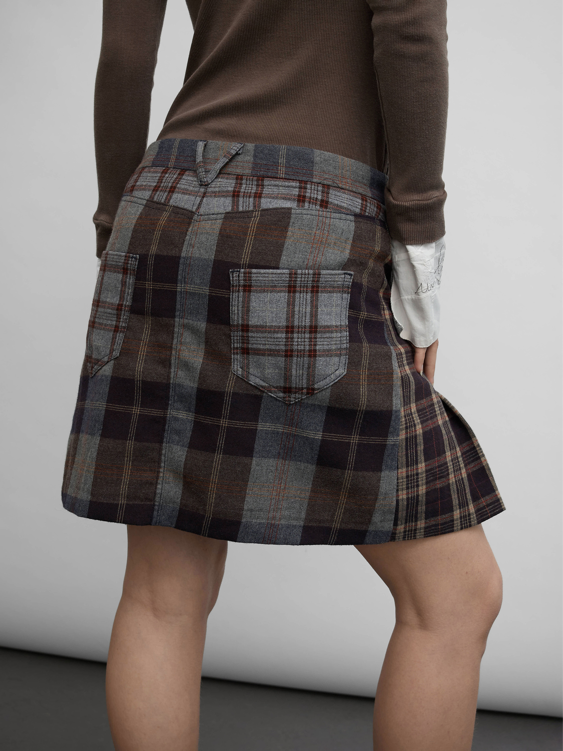 Nolita (De Luxe line) brown and grey tone tartan pleated mini skirt with twin row leather straps and rear pockets. Satin lining.