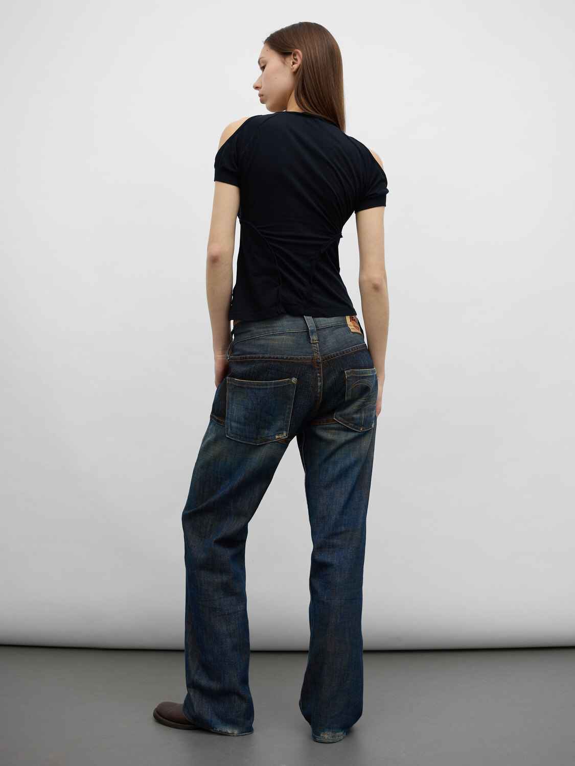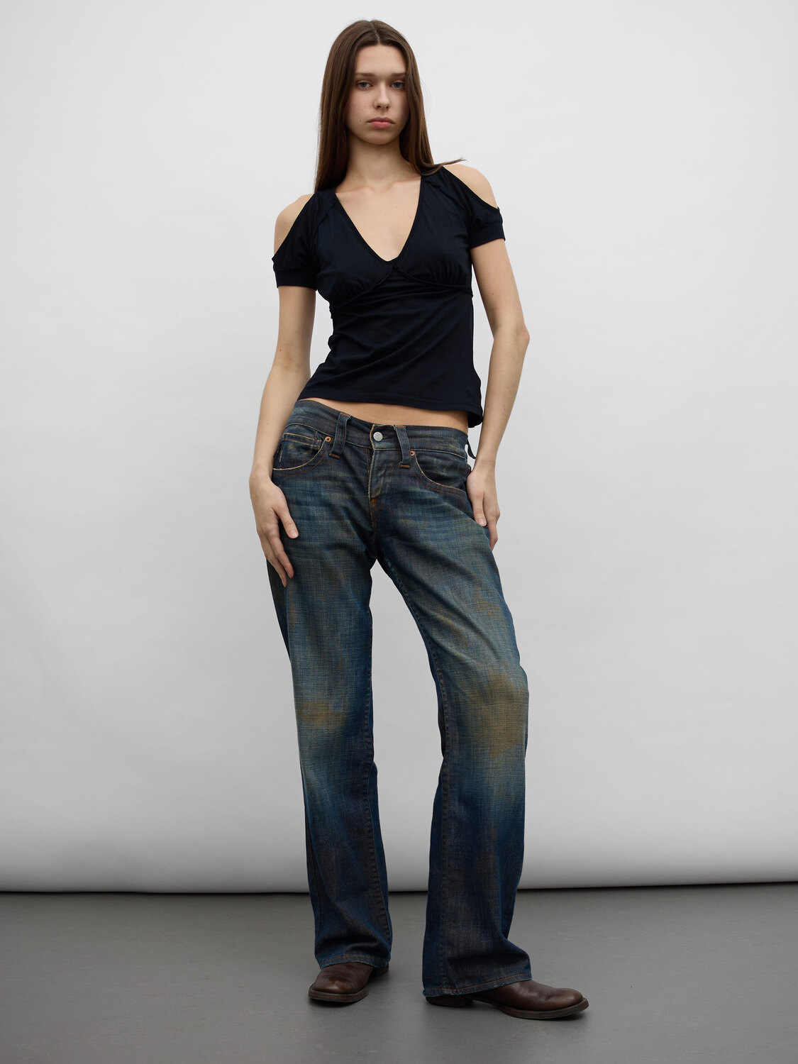 C’N’C Costume national black cotton cold shoulder blouse with gathered details.