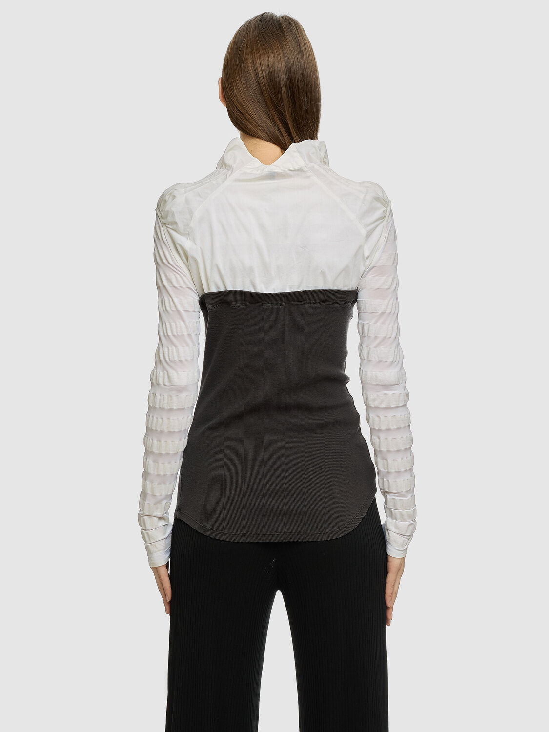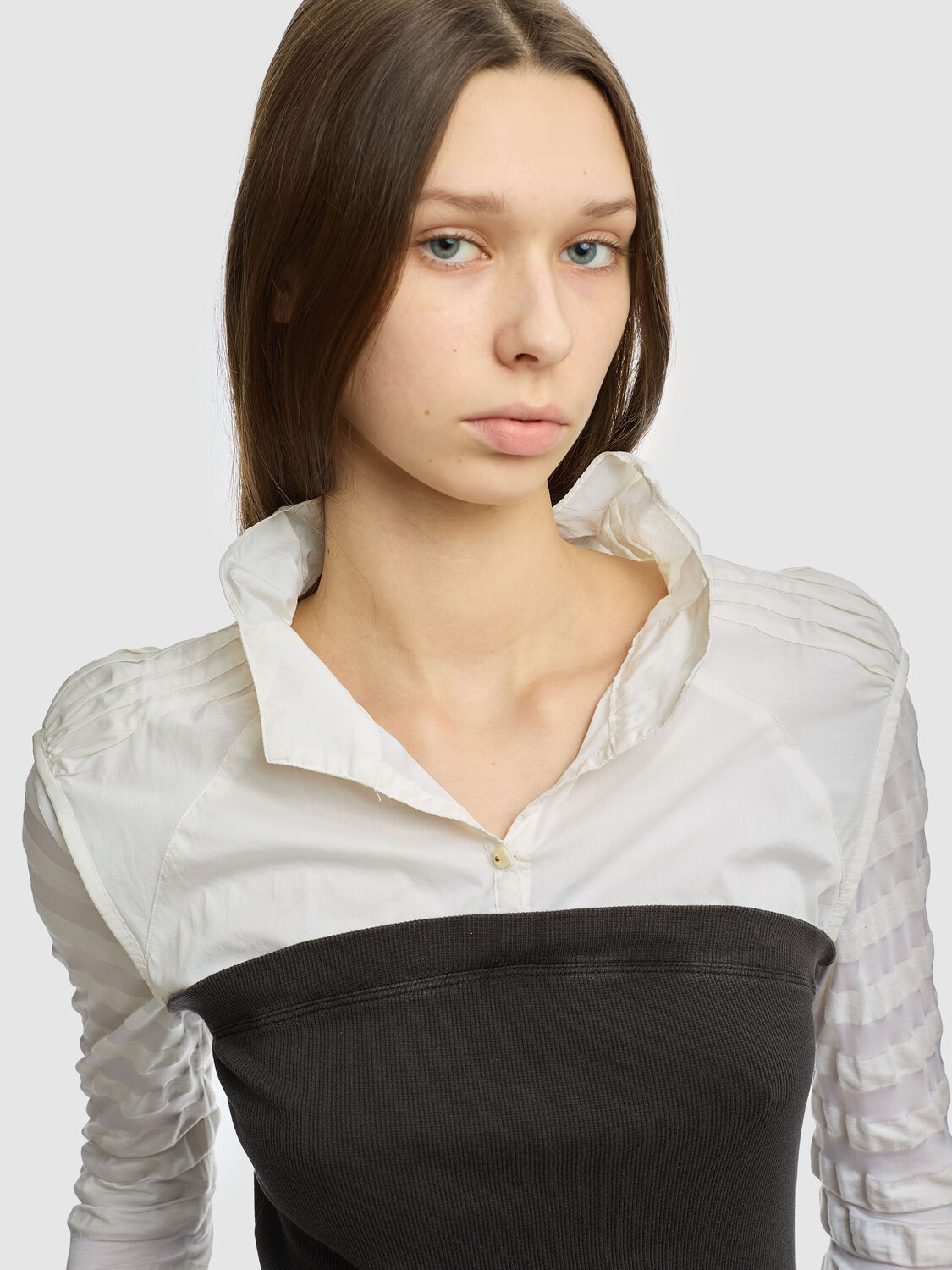 Cop Copine 3-in-one piece layered long-sleeve top featuring deconstructed shirt details at the top, ribbed gray bustier with rounded hem, striped fine-knit inner layer and sleeves and embroidered brand tag.