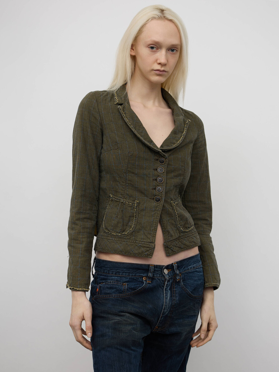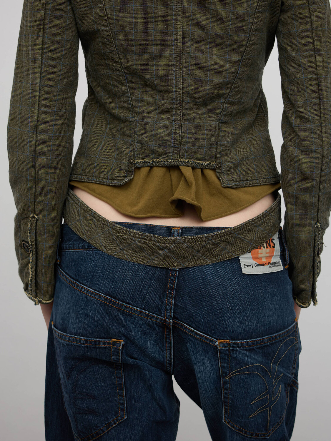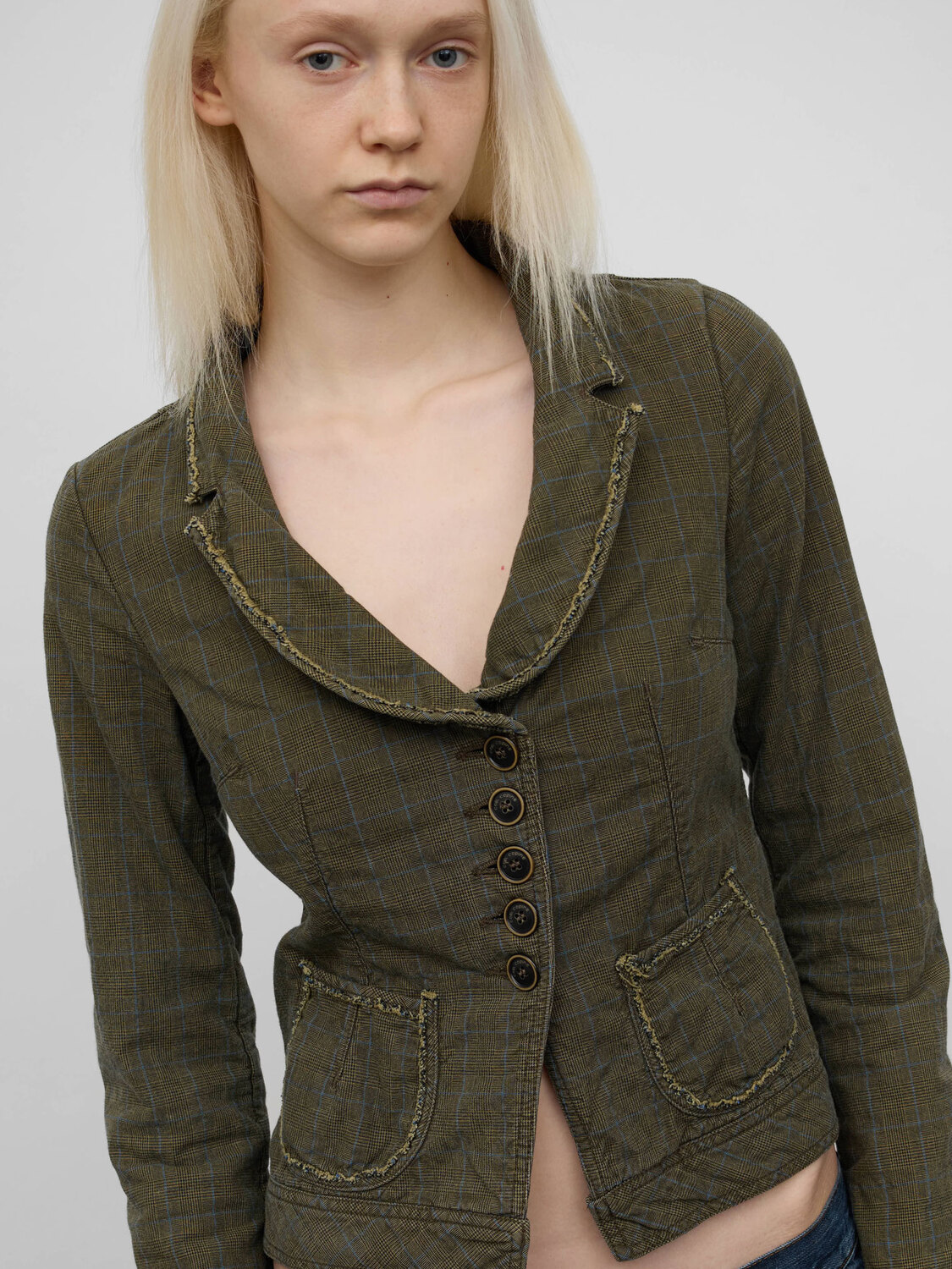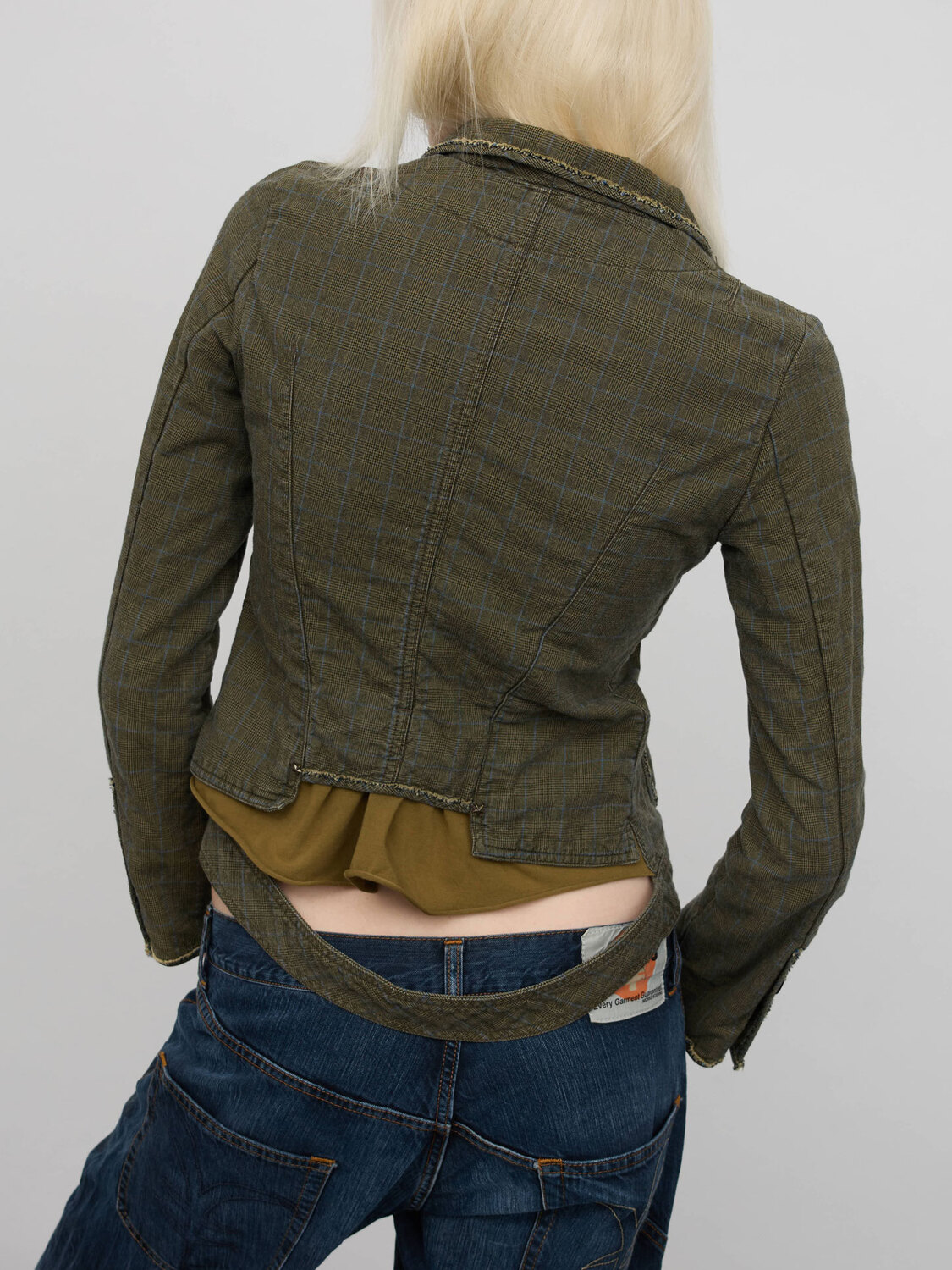 Cop Copine grey tweed pattern jacket with patchwork-style pockets and a cutout detail at the back.