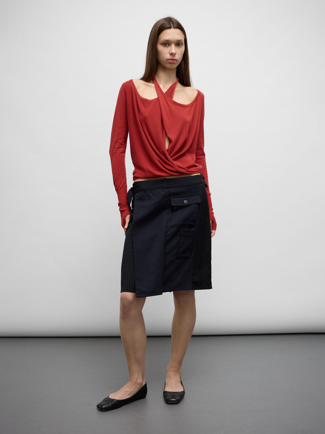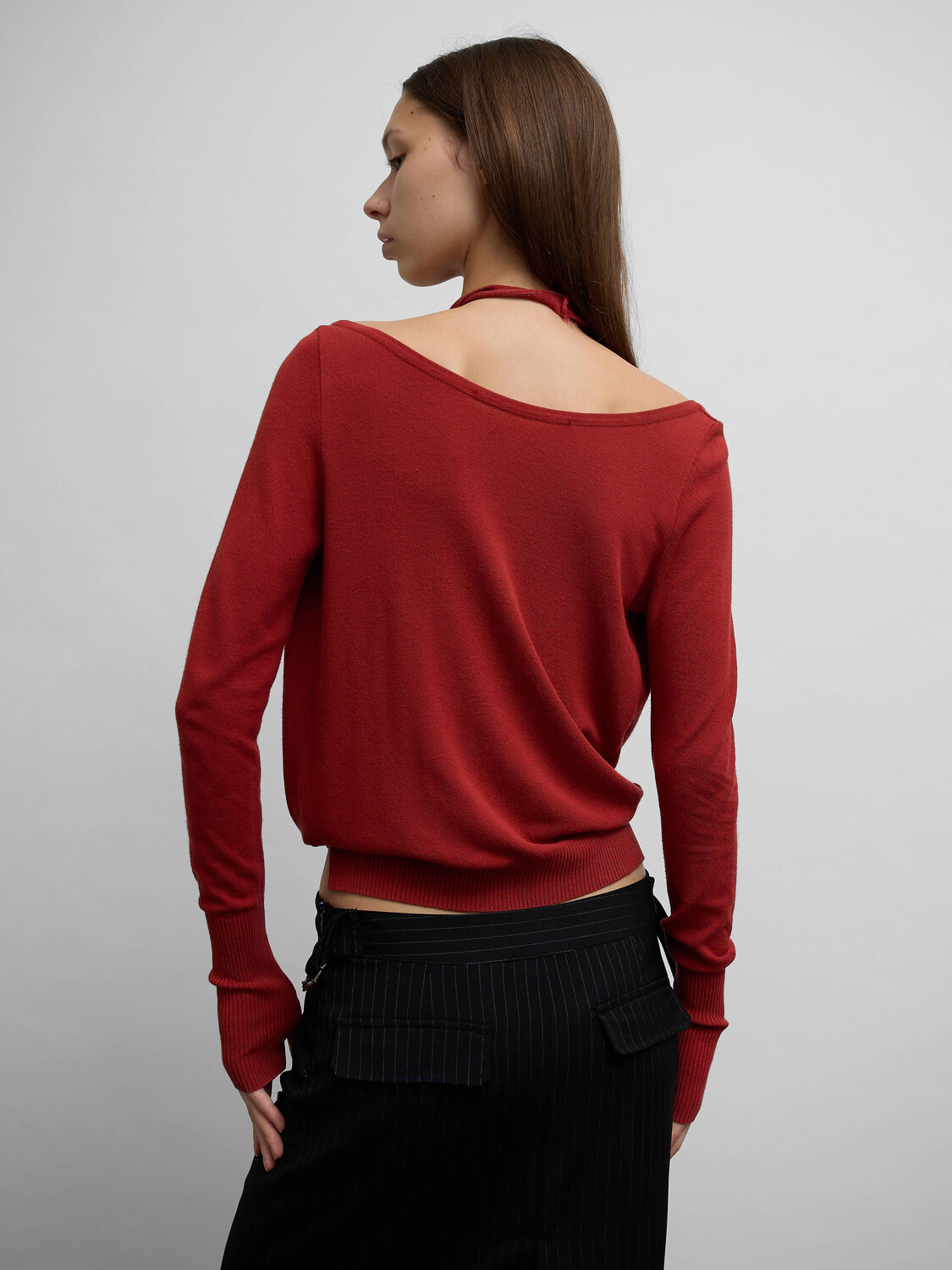 Cora Kemperman vermilion red draped fine knit jumper. Ribbed cuffs with finger holes.