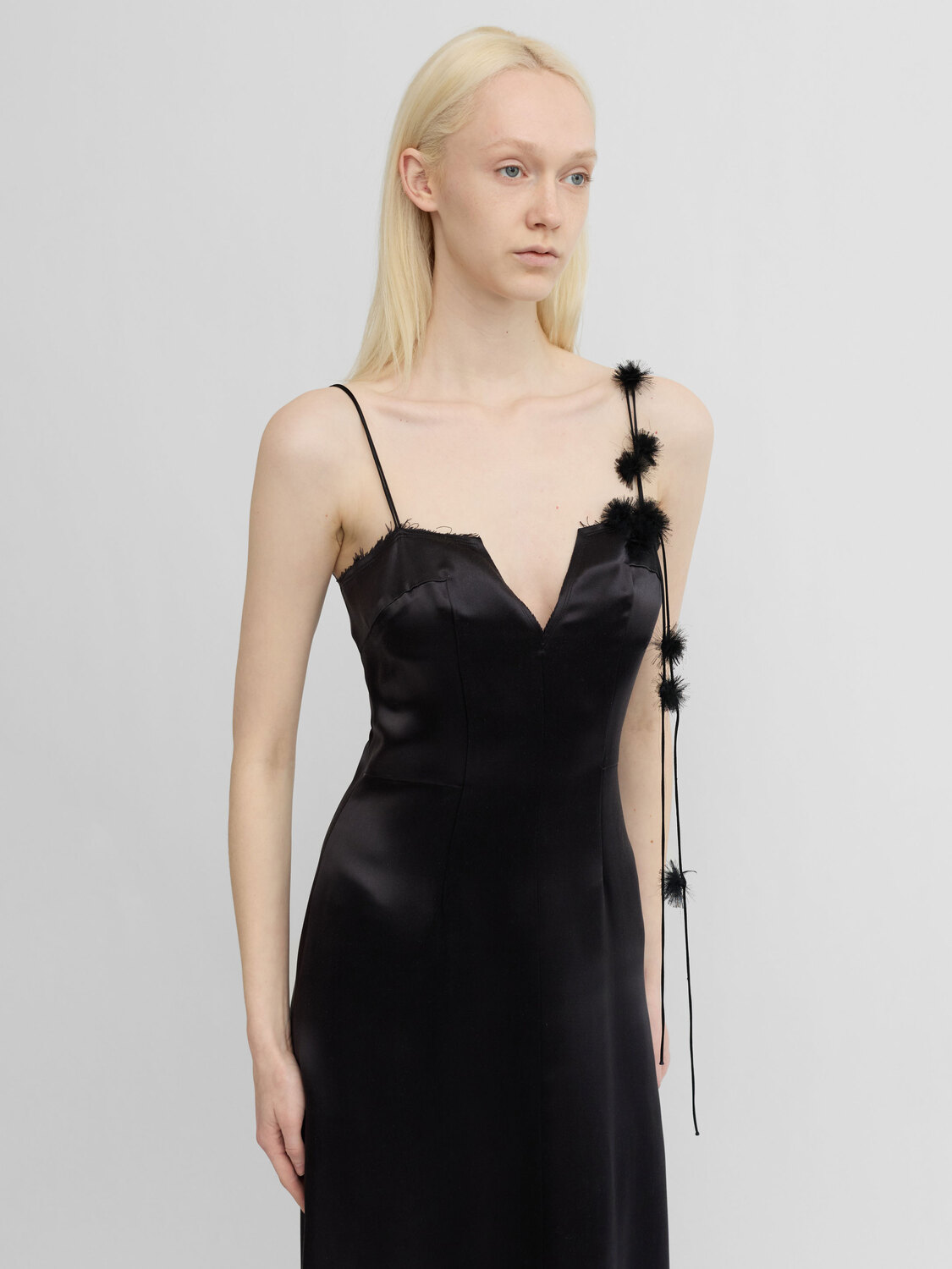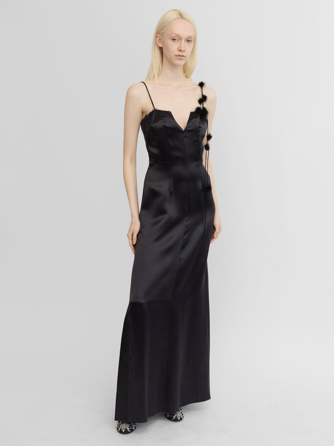 Faycal Amor black heavy satin maxi dress with twin spaghetti straps, pom poms and concealed zipper closure at the back.