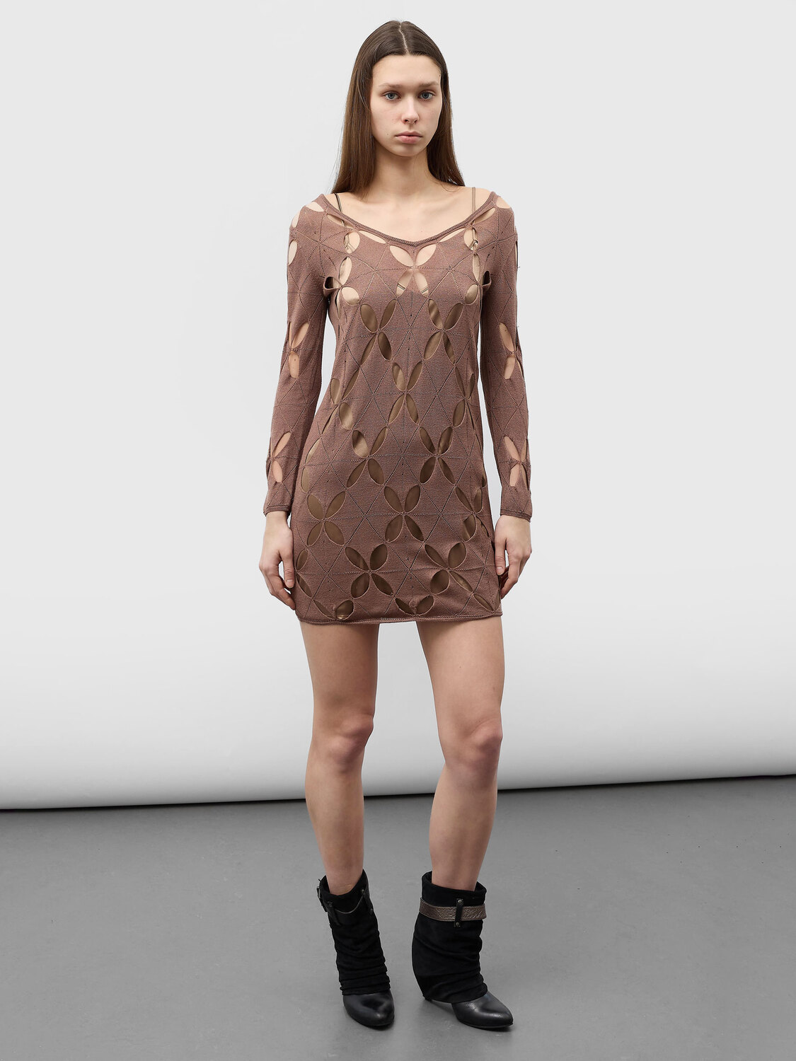 John Galliano taupe open-knit mini dress with cutout ornament details and a bronze satin chemise that can be worn separately.