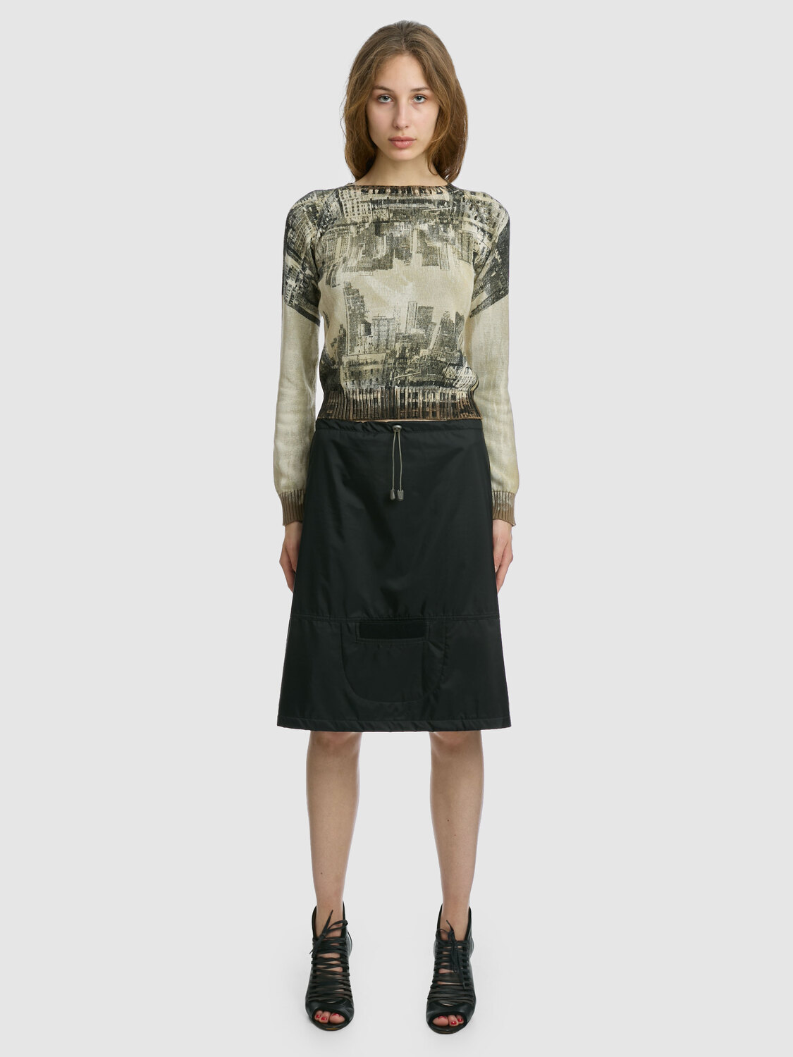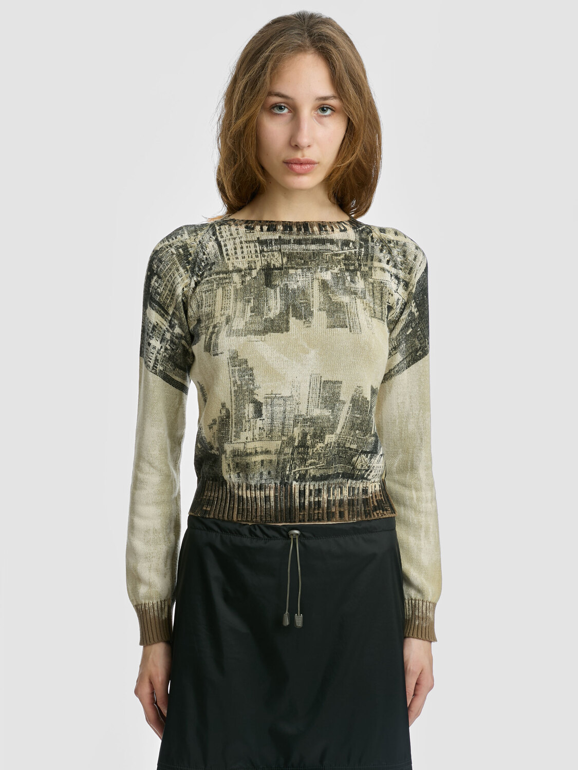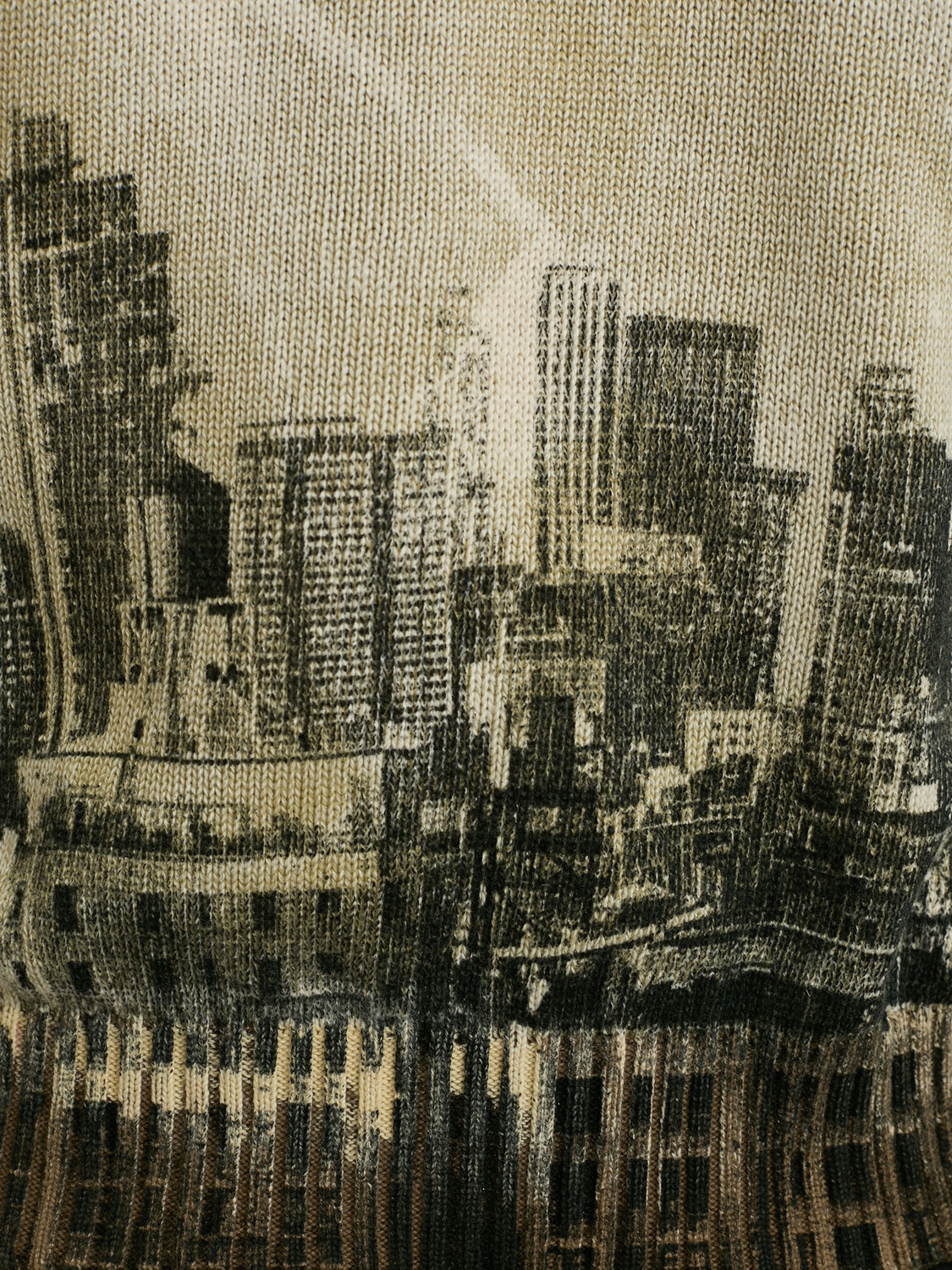 E-Play beige-tone cotton knit jumper with black and white cityscape print and ribbed collar, cuffs and hem.