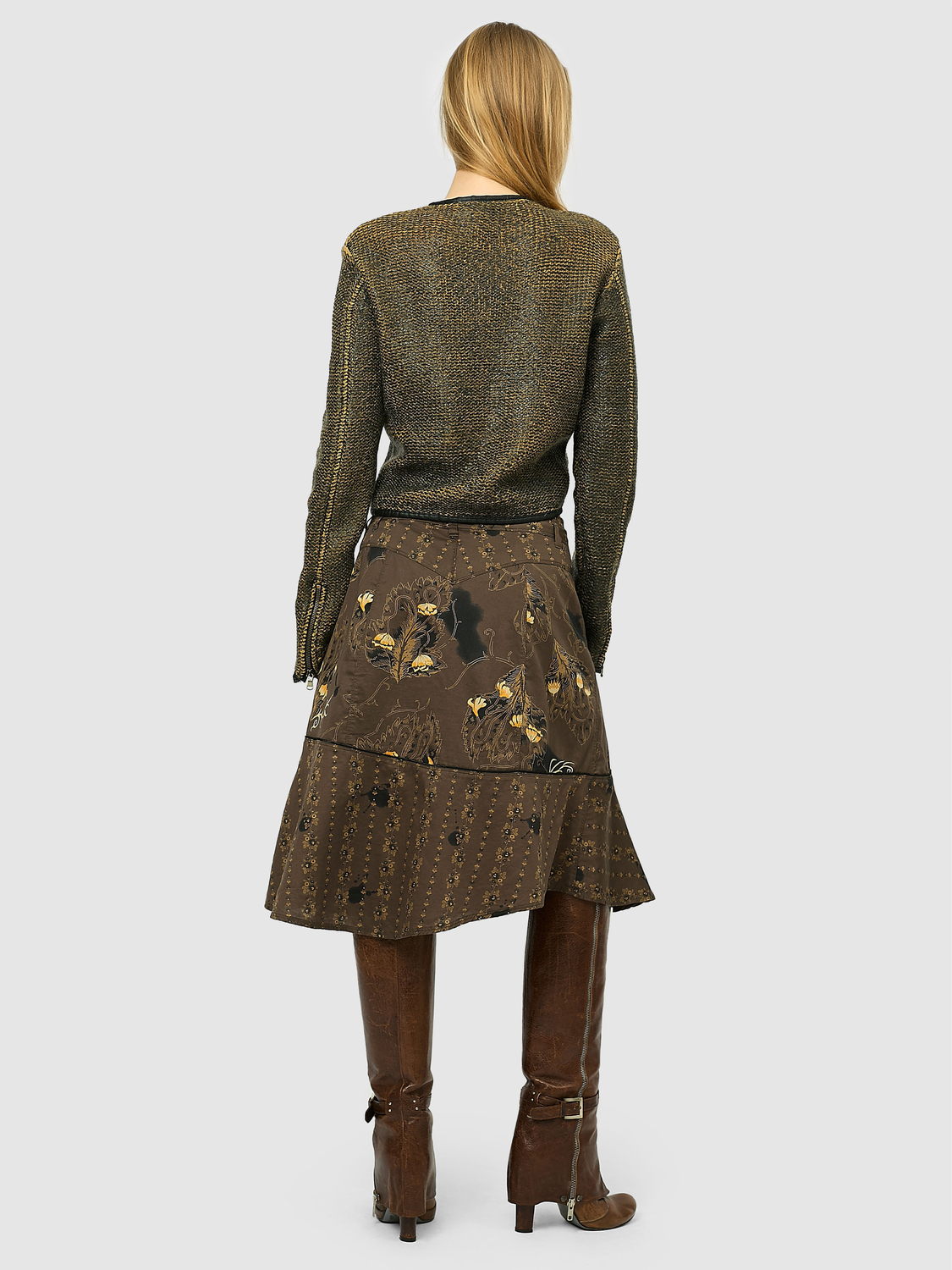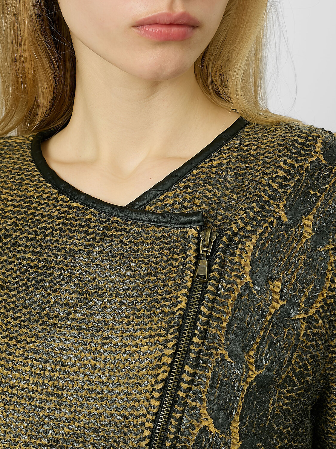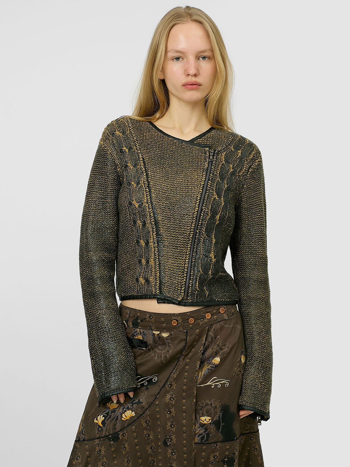 Beige and black coated effect cable knit cardigan. Snakeskin effect with asymmetrical zipper closure and zipped cuffs. Faux leather trim.