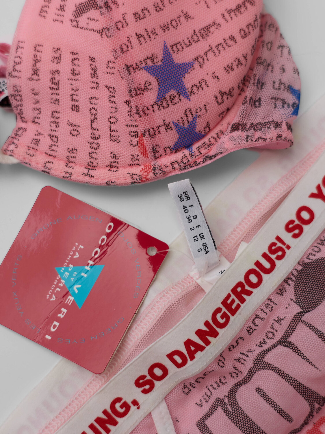 Occhi Verdi by La Perla lingerie set in pink mesh with a newspaper-style print and contrast white piping.