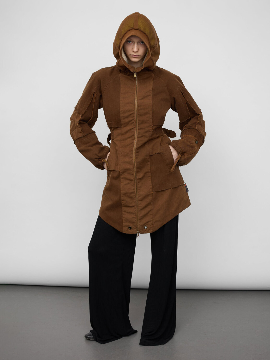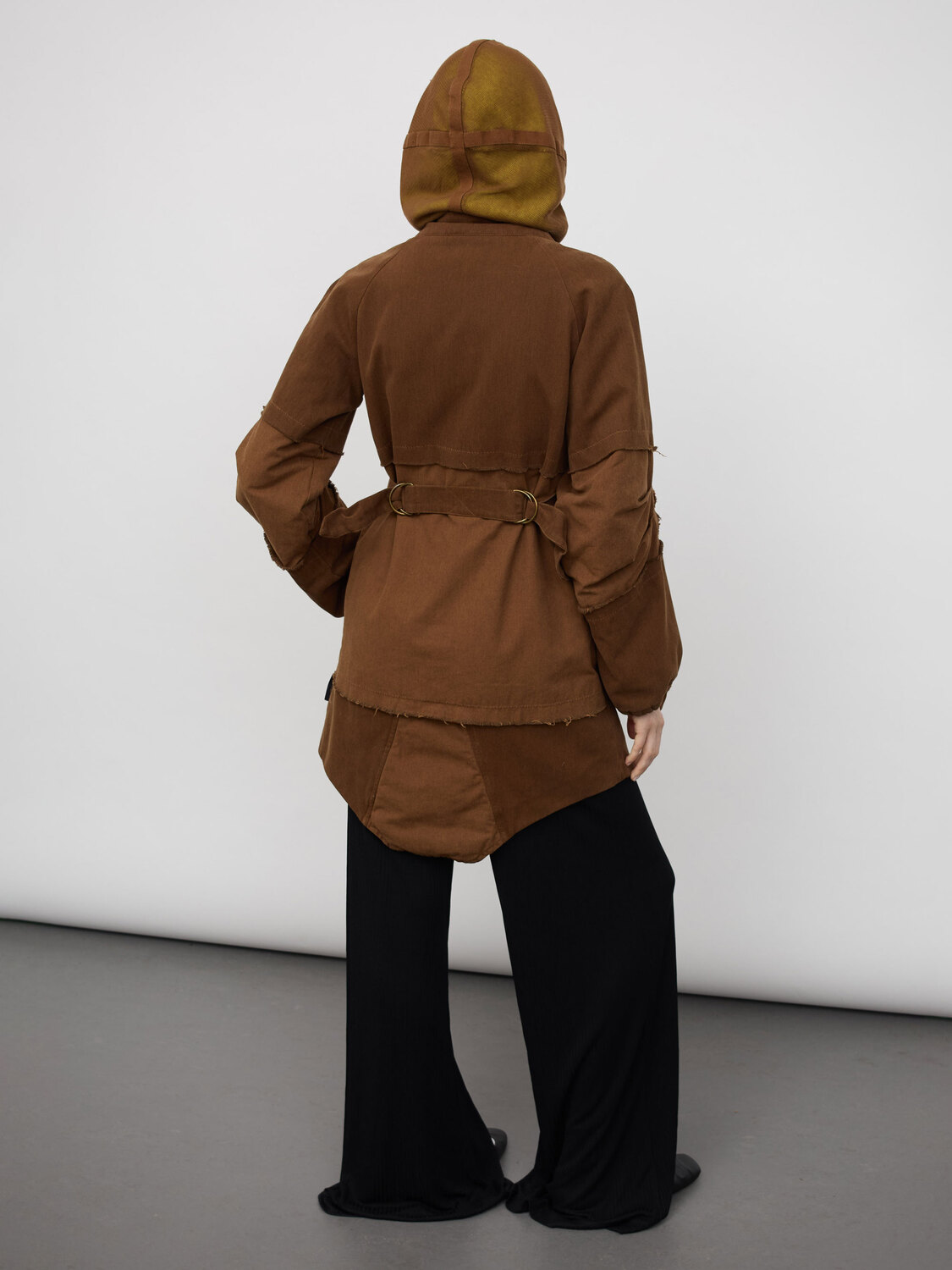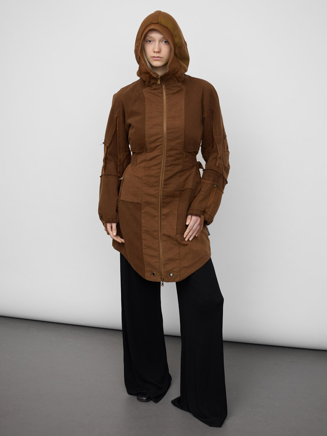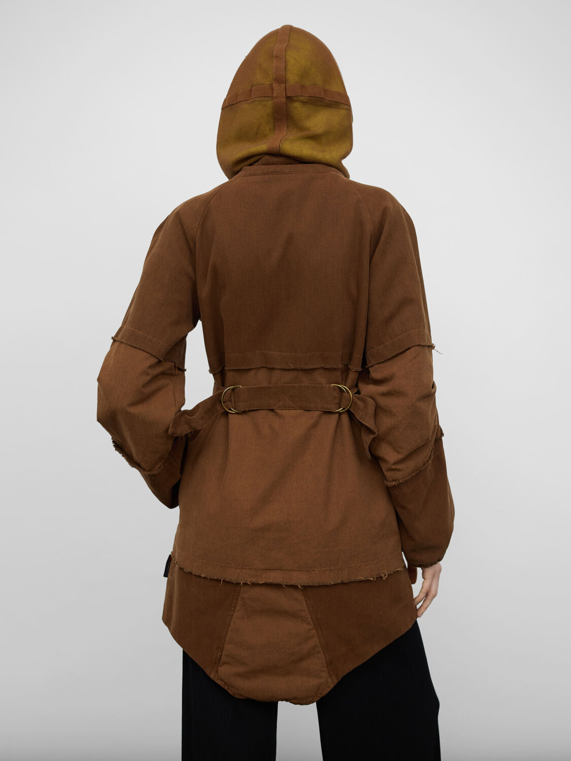 Michiko Koshino brown canvas patchwork hooded coat. Mesh details. Adjustable waist. Zipper closure.