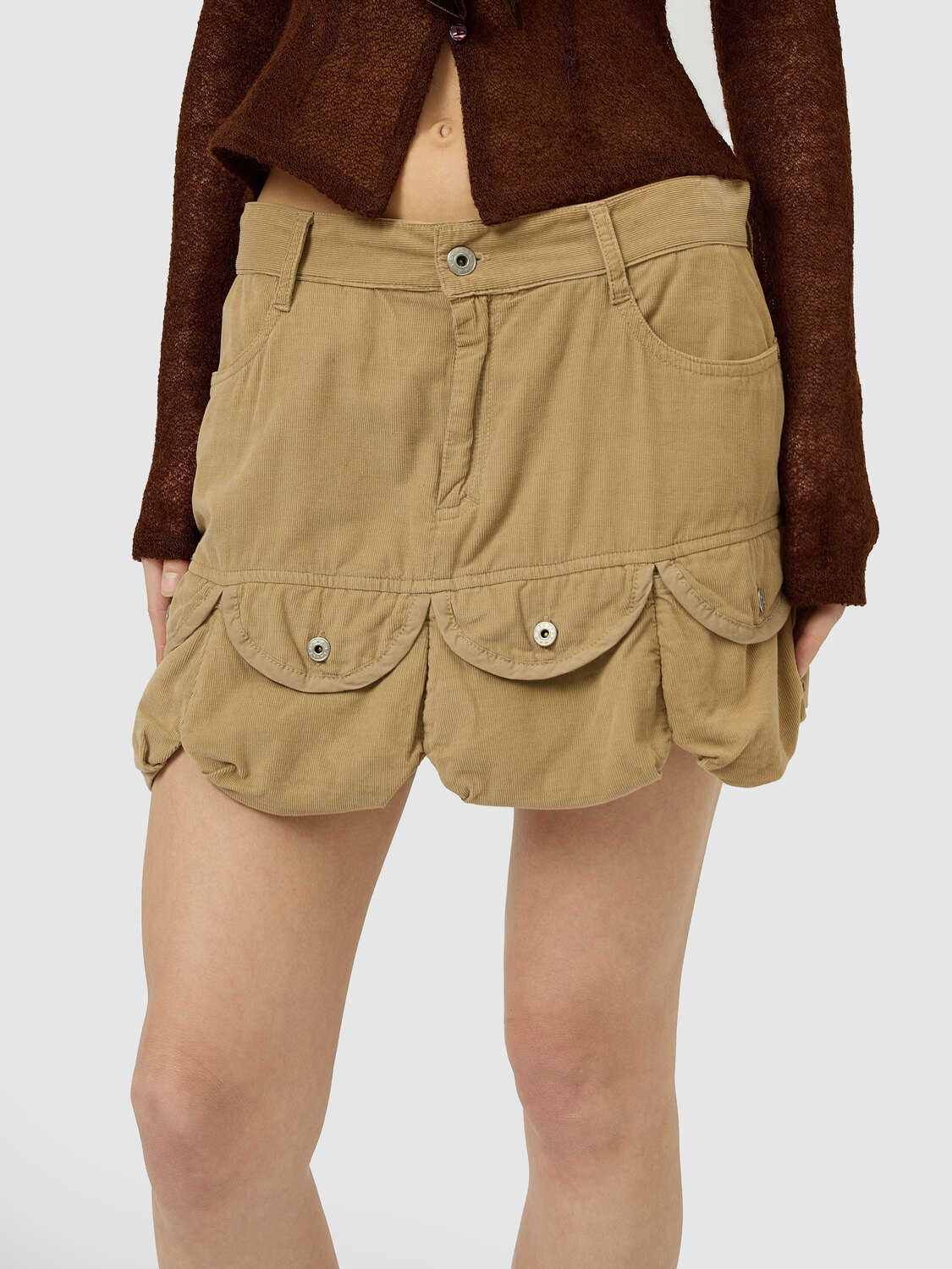Michiko Koshino beige corduroy bubble mini skirt with pockets around the hem.