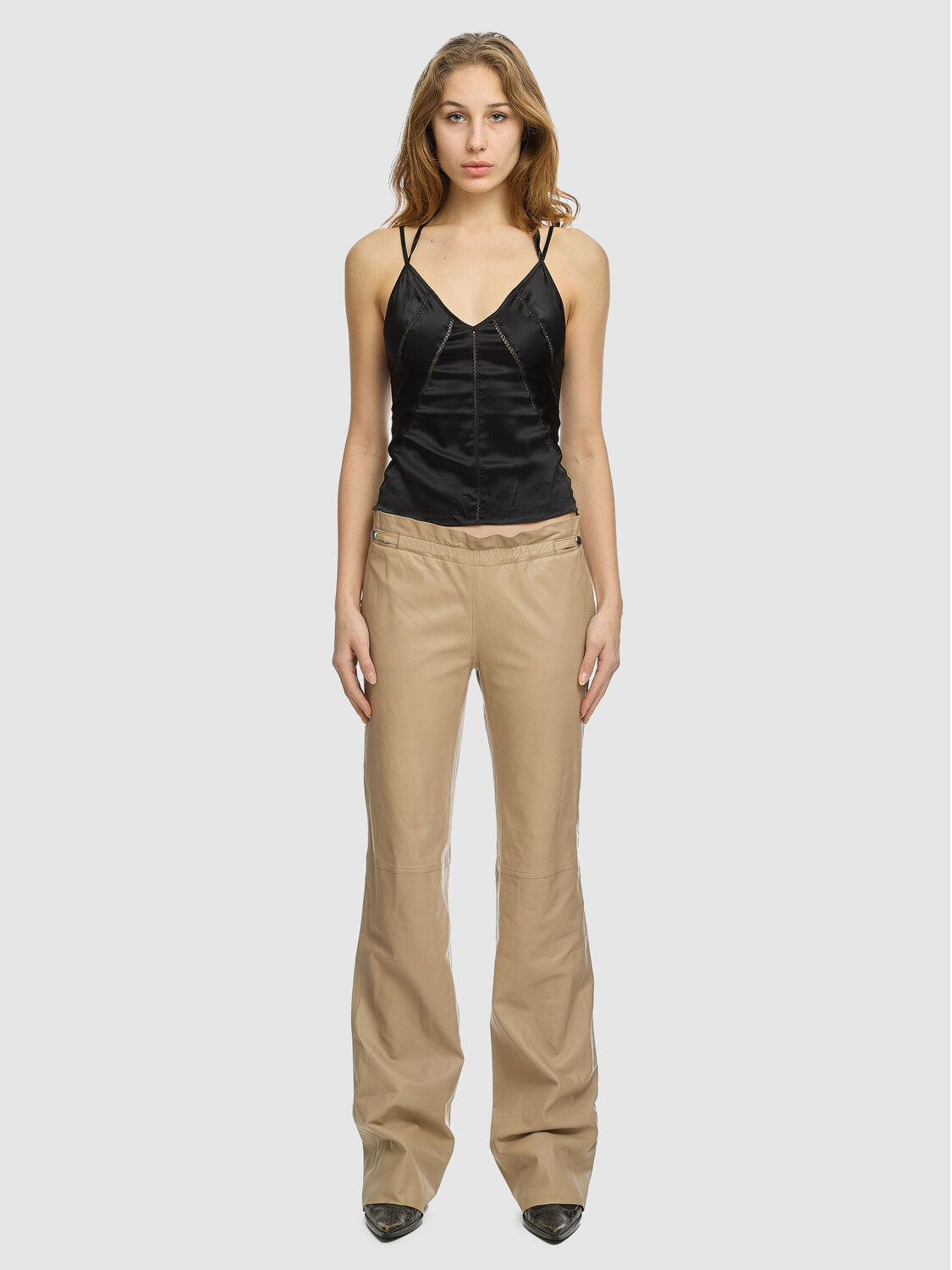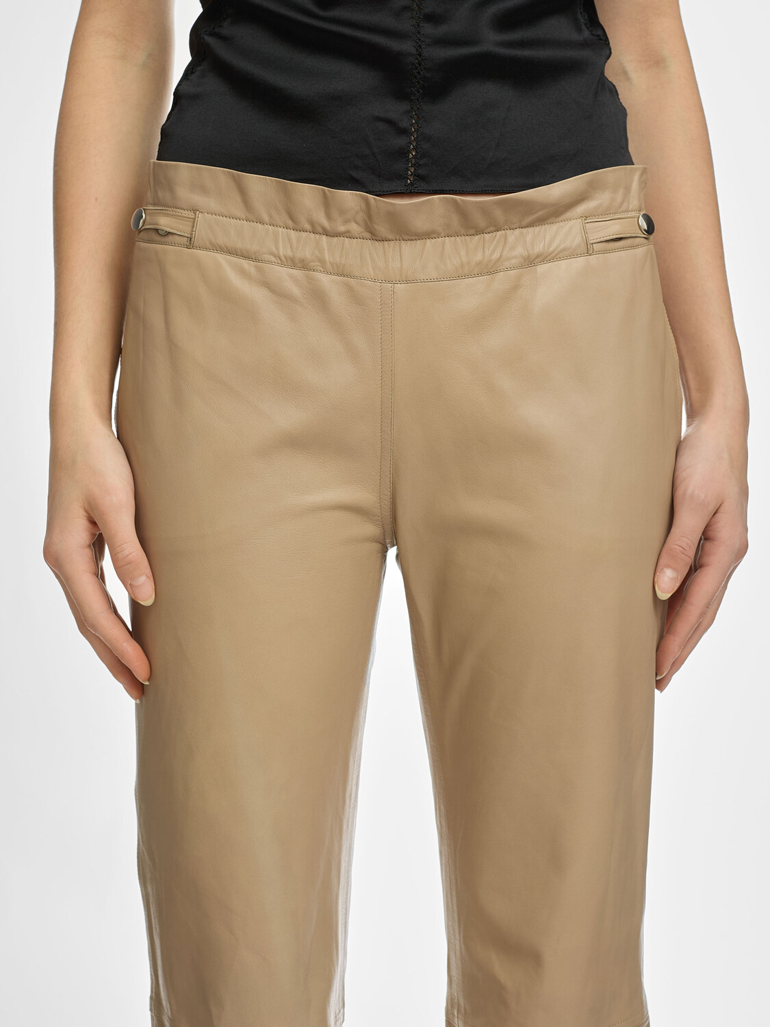 Plein Sud beige leather trousers with an adjustable elasticated waist. Satin lining.