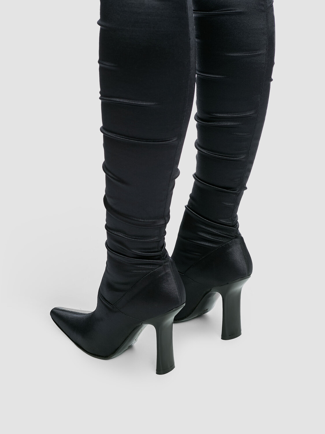 Plein Sud black stretchy satin gathered effect pointed toe over-the-knee heeled boots.