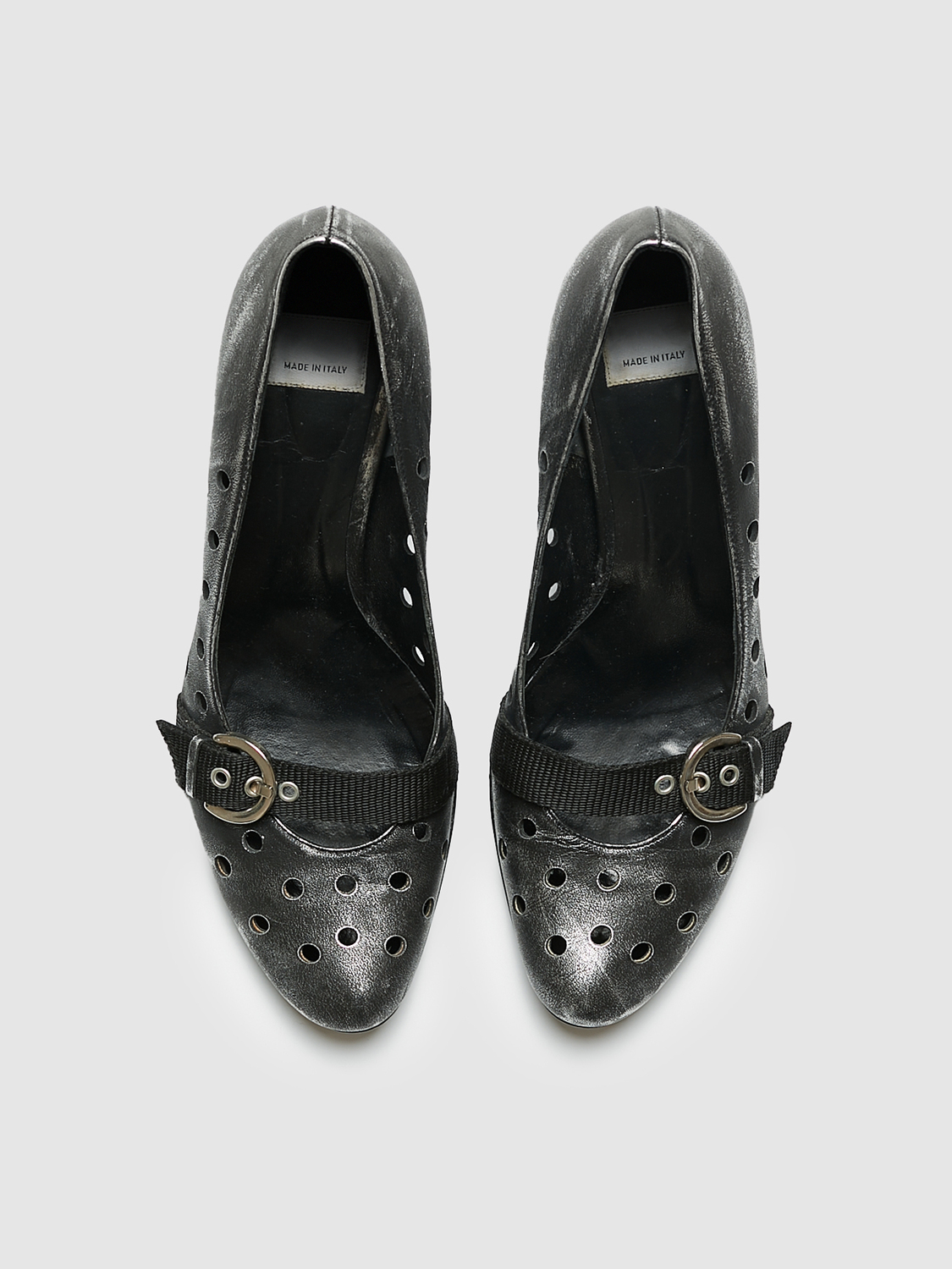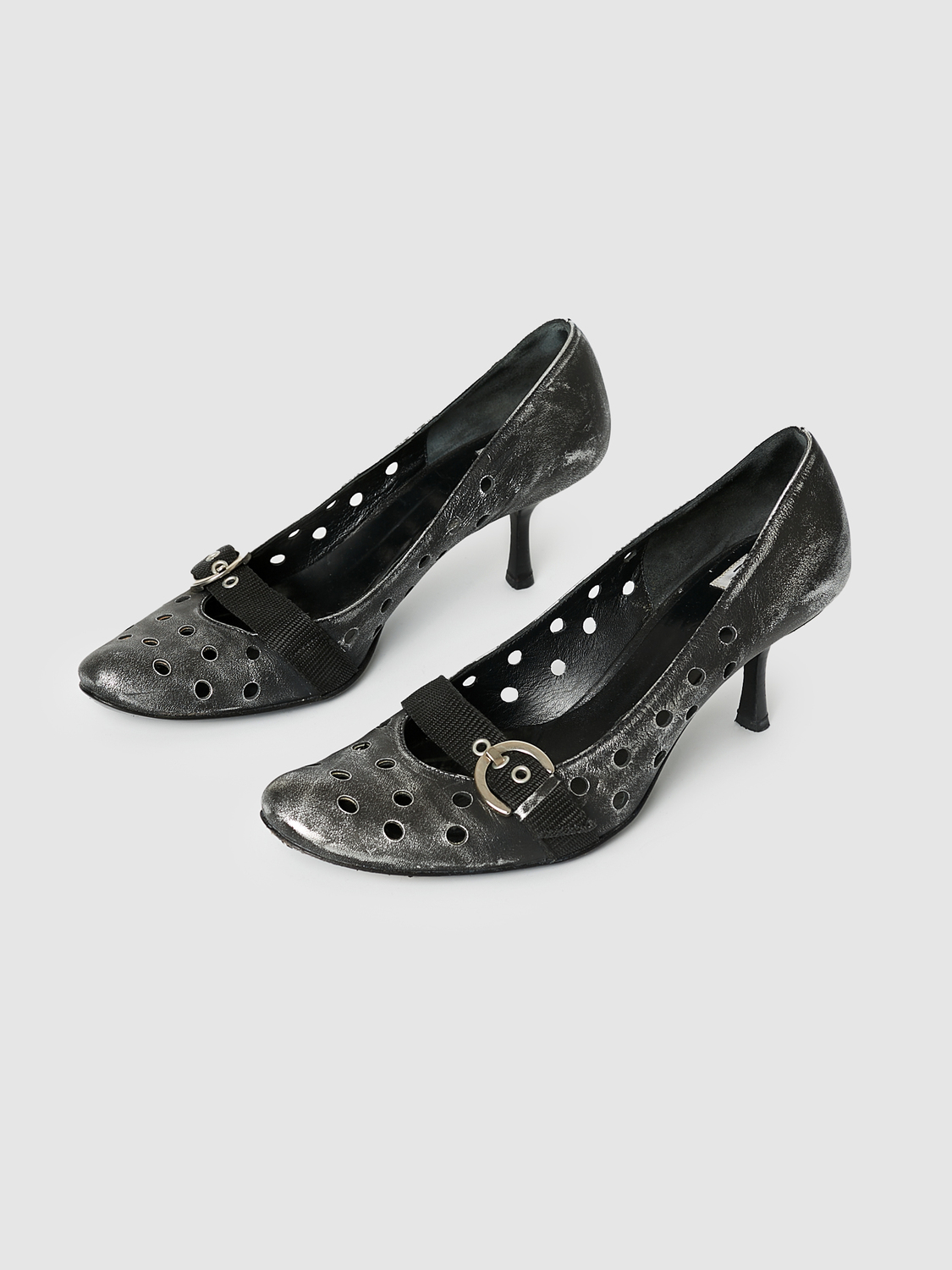 Silver-grey leather perforated heels with black utility style straps and silver-tone metal buckles.
