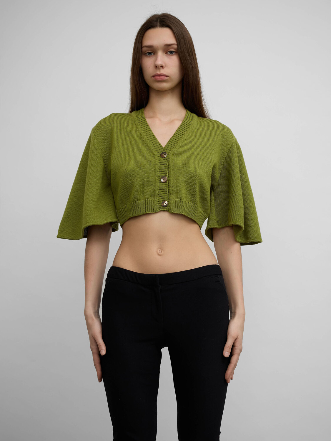Aquagirl (by Faycal Amor) green cropped cardigan with flared sleeves.