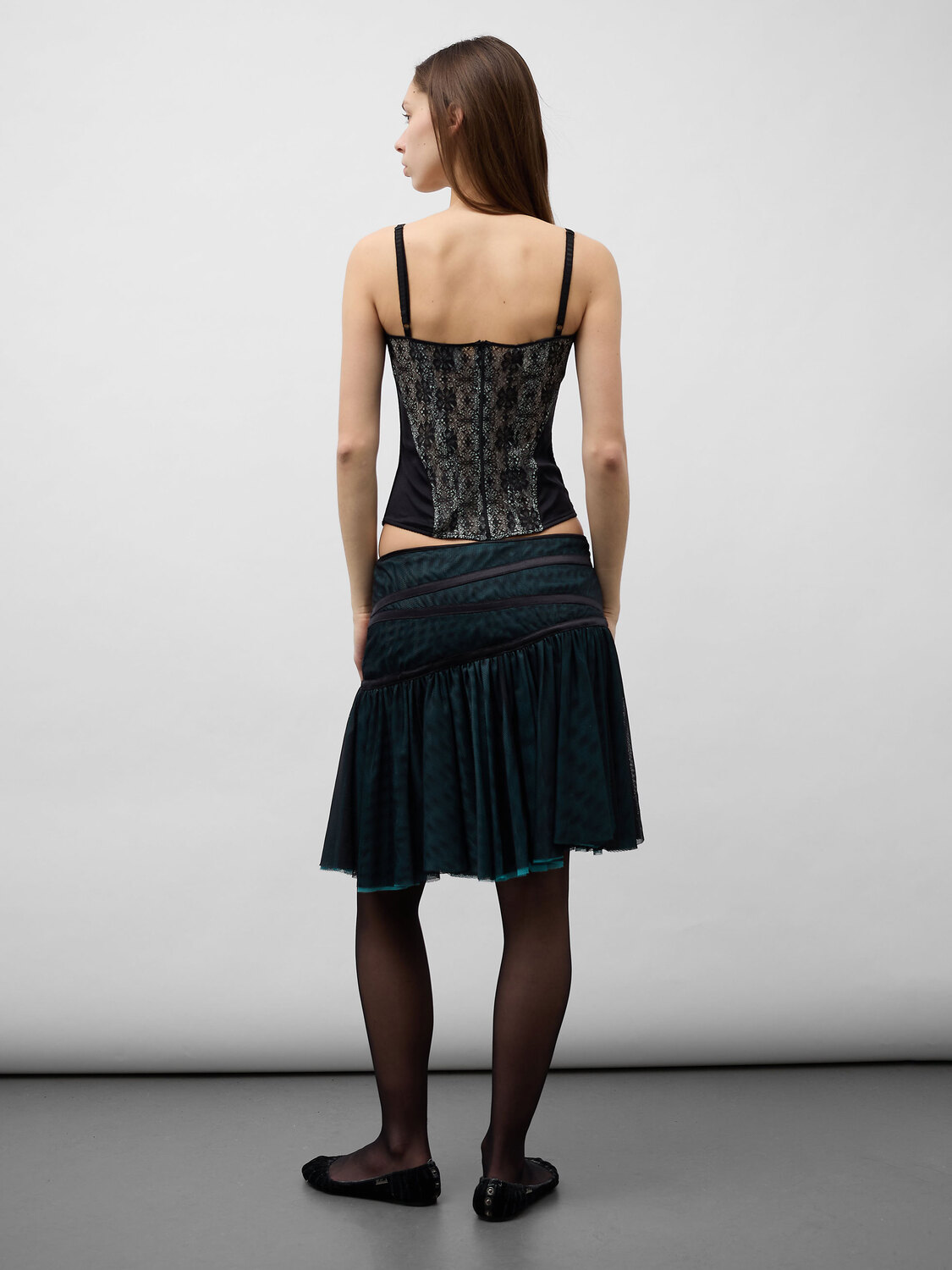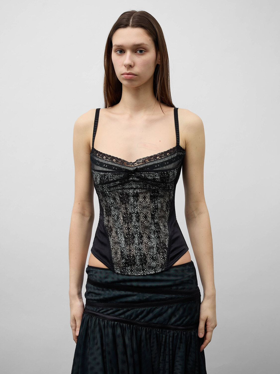 Black lace and satin corset top with adjustable shoulder straps and zipper closure at the back.