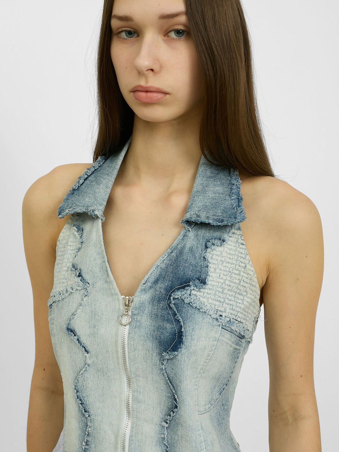 Light blue denim deconstructed zip-up vest with a logo print.