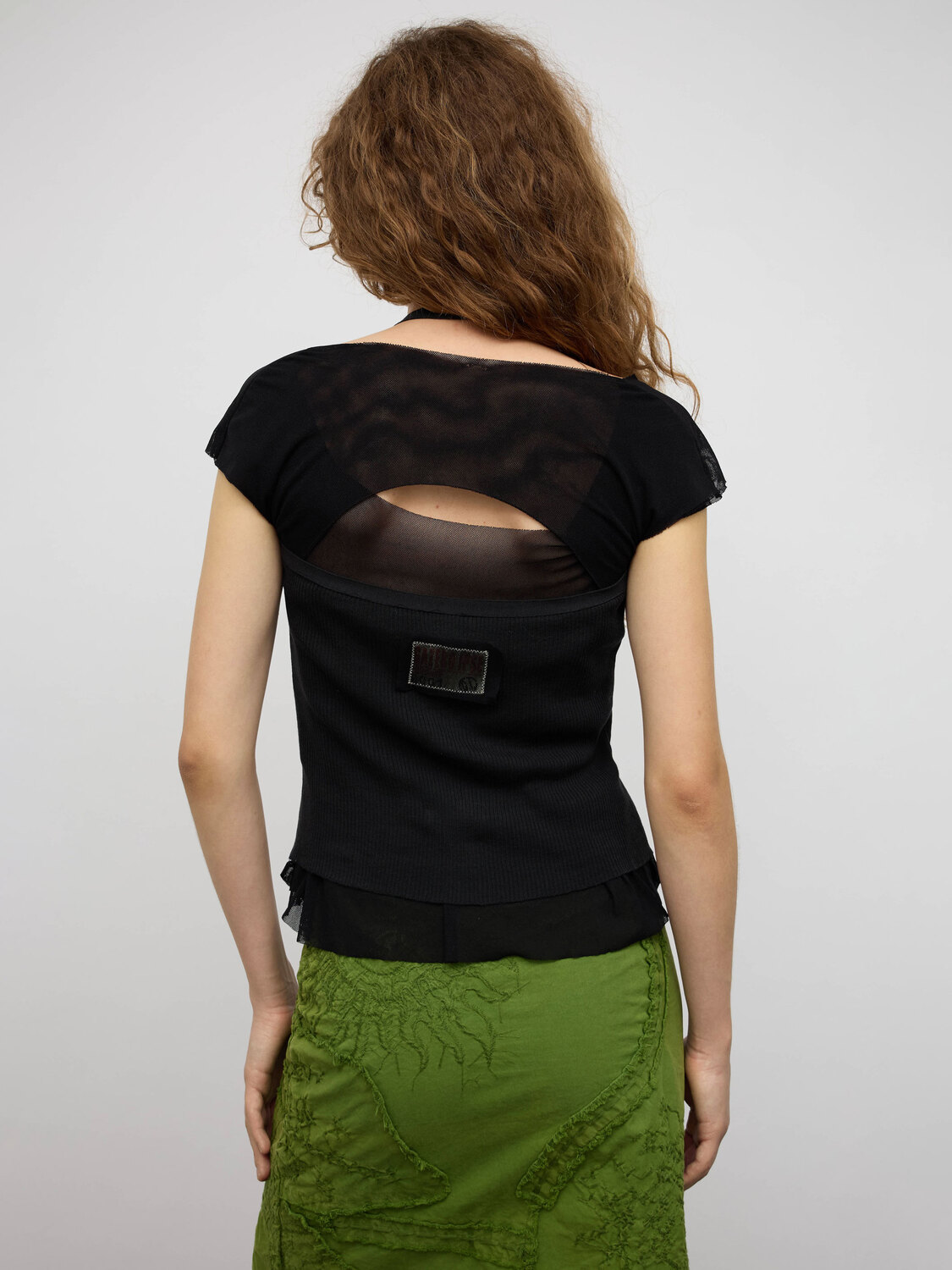 Gazebo black mesh cap-sleeve top featuring an integrated rib-knit bustier with hook-and-eye closure.. Cut-out detail at the back.