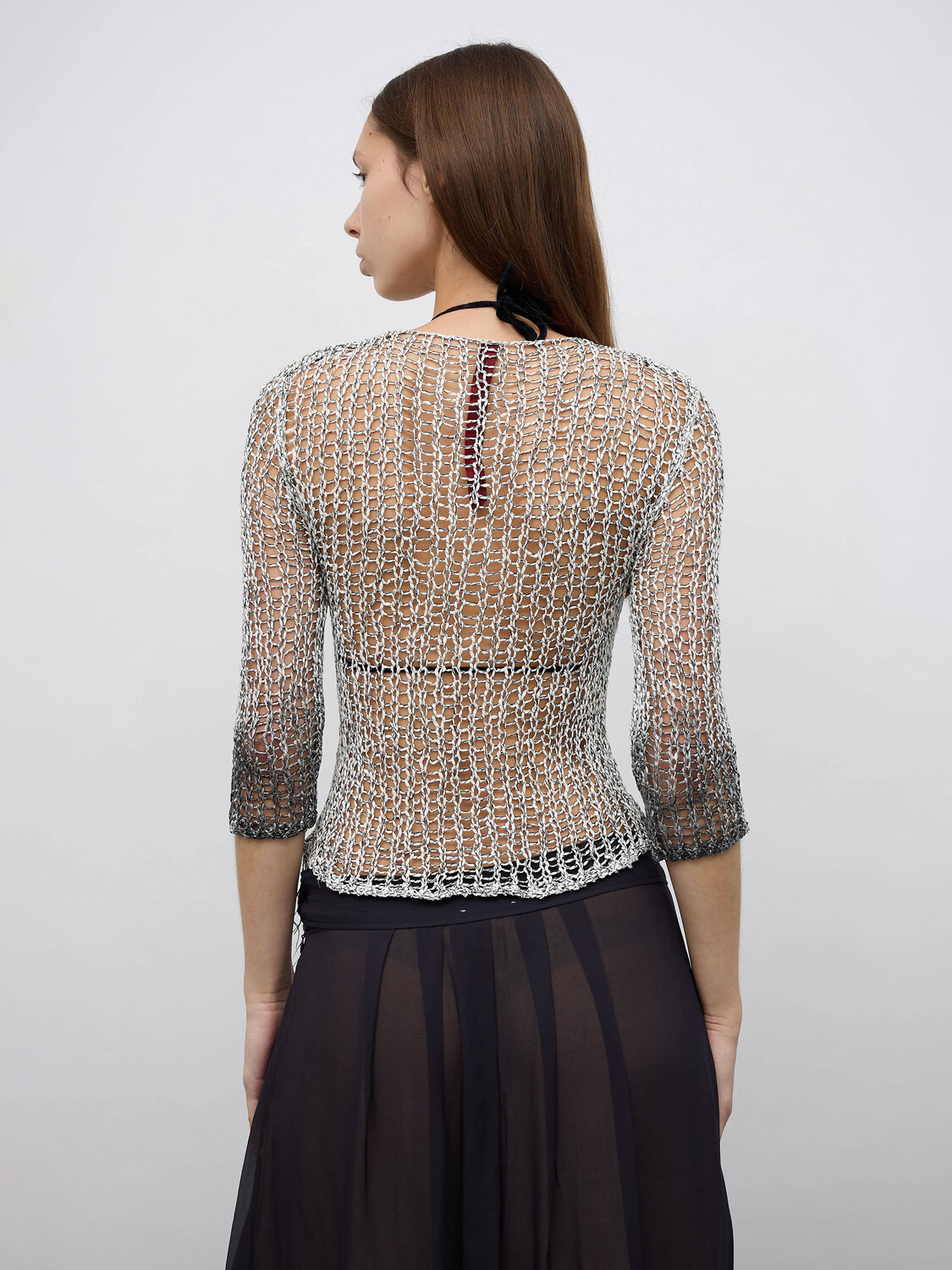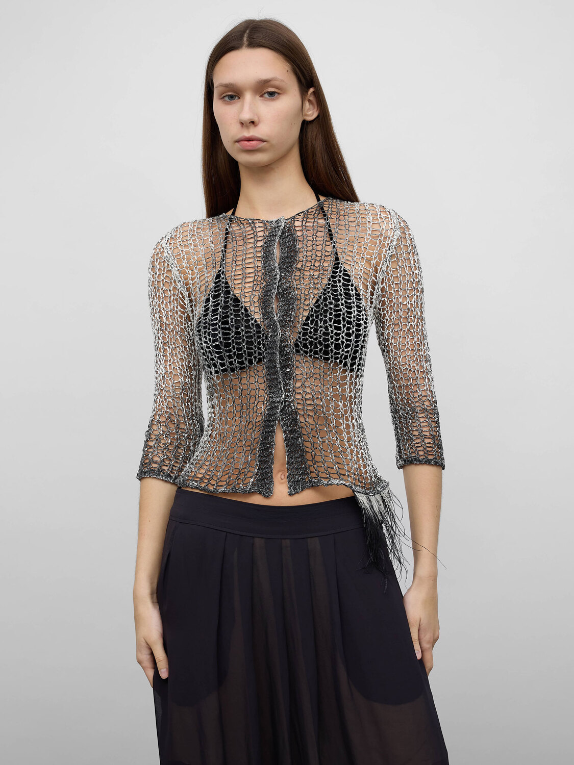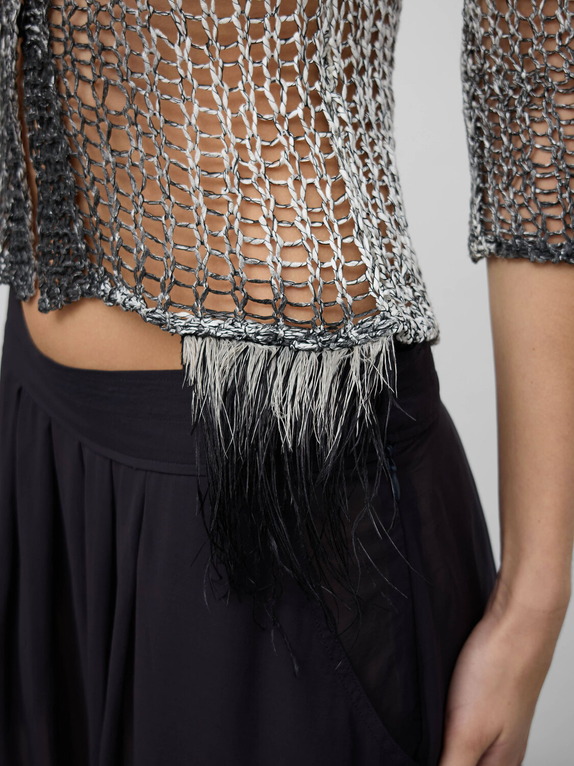 Gazebo black and white melange open knit cardigan with snap button closure and feather detail on the sides.