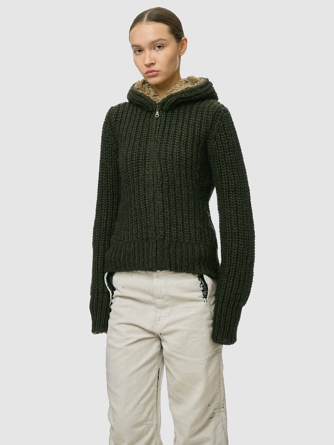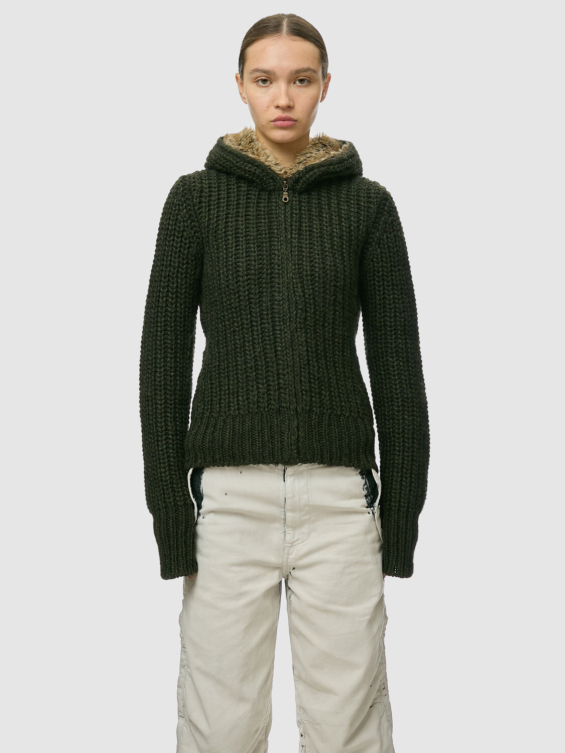 Miss Sixty dark green chunky rib-knit hooded cardigan with zipper closure and faux fur lining on the hood.