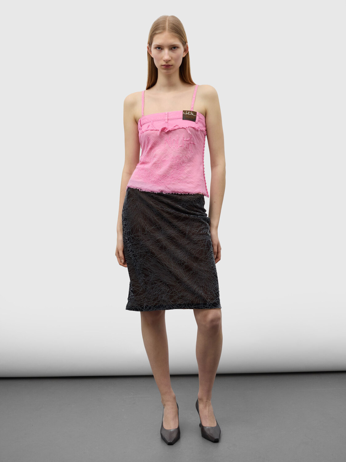 Nolita deconstructed white mesh top with a denim trim and a sunflower embroidery. Raw finish.