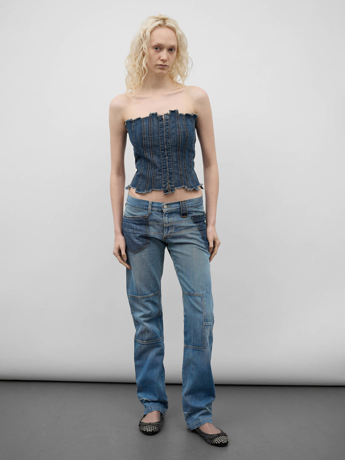 Plein Sud Jeans deconstructed blue denim bustier. Raw finish. Hook and eye closure at the front.