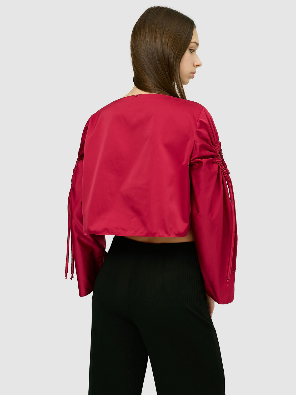 Sportmax framboise red shiny satin cold shoulder top. Gathered details, adjustable with ties.