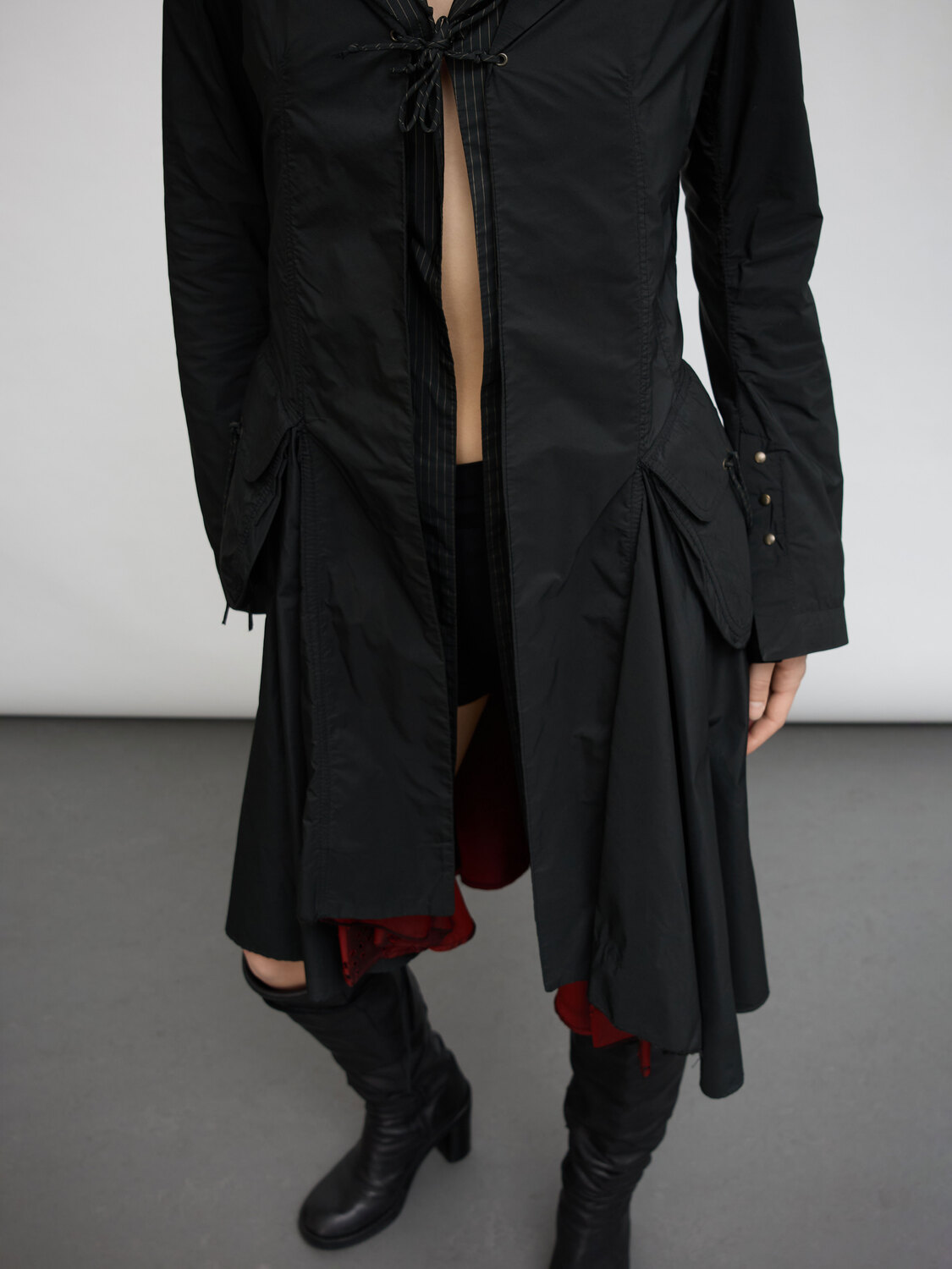 Black shell material jacket with integrated pinstripe blazer-style lapels. Snap-button adjustable cuffs. Pleated details at the back.