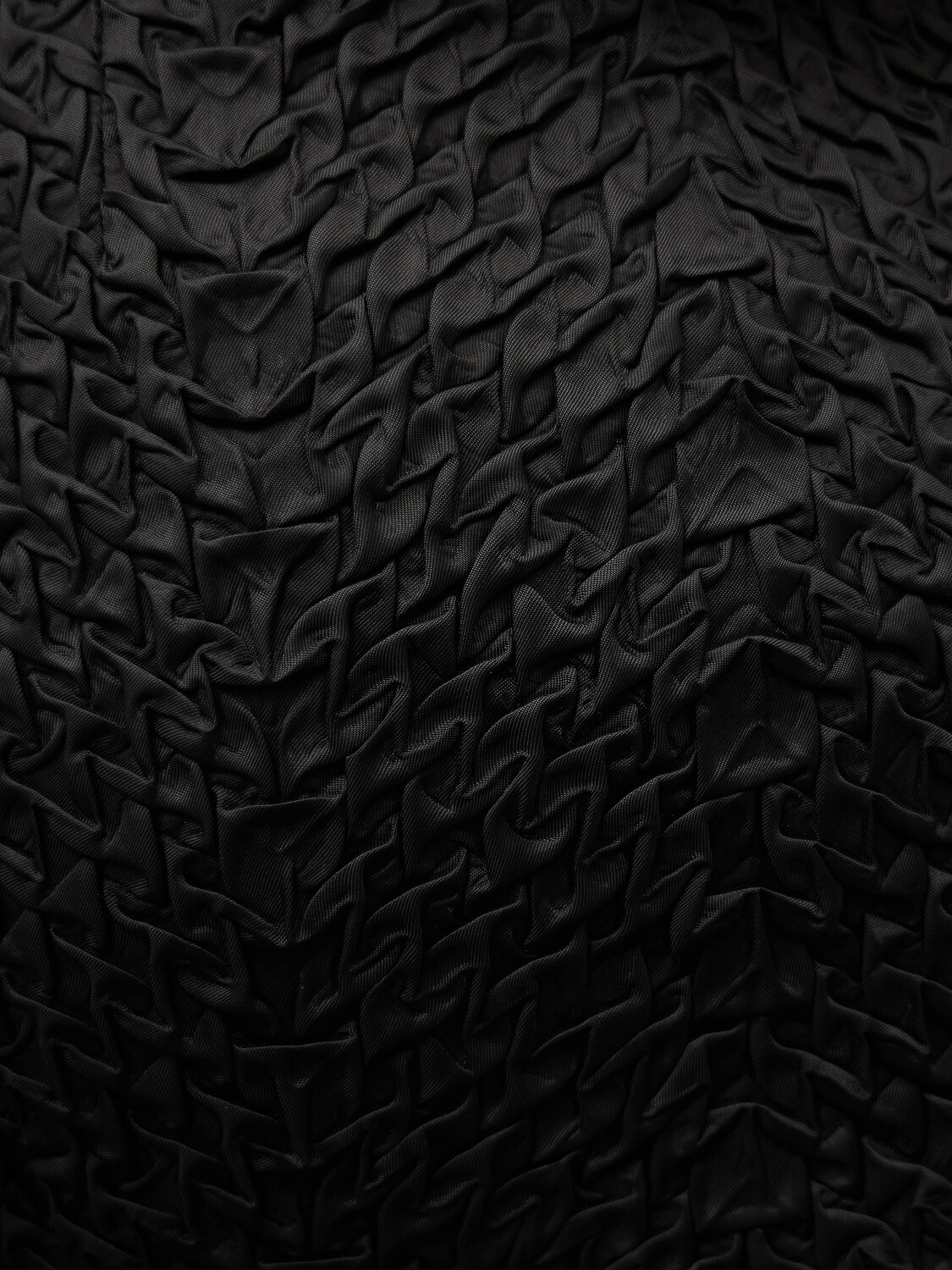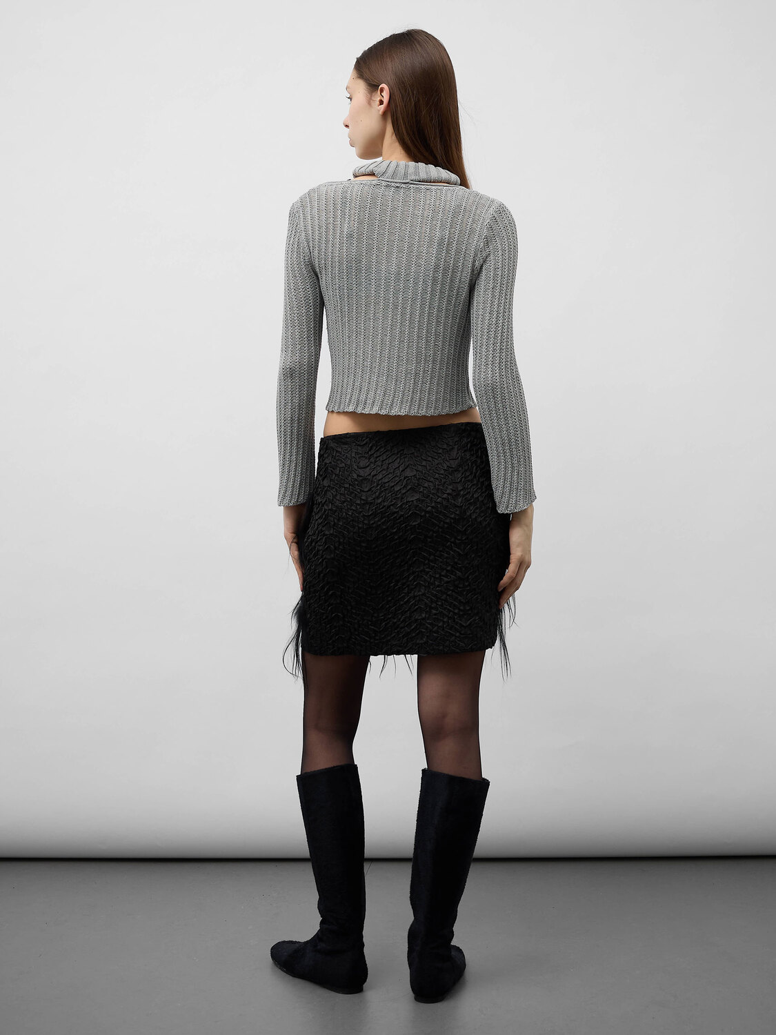 Philosophy di Alberta Feretti black scrunched satin mini skirt with fur inserts. Concealed zipper closure on the side.
