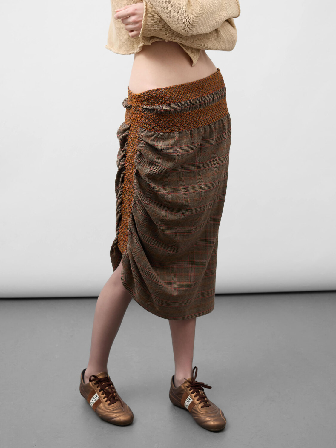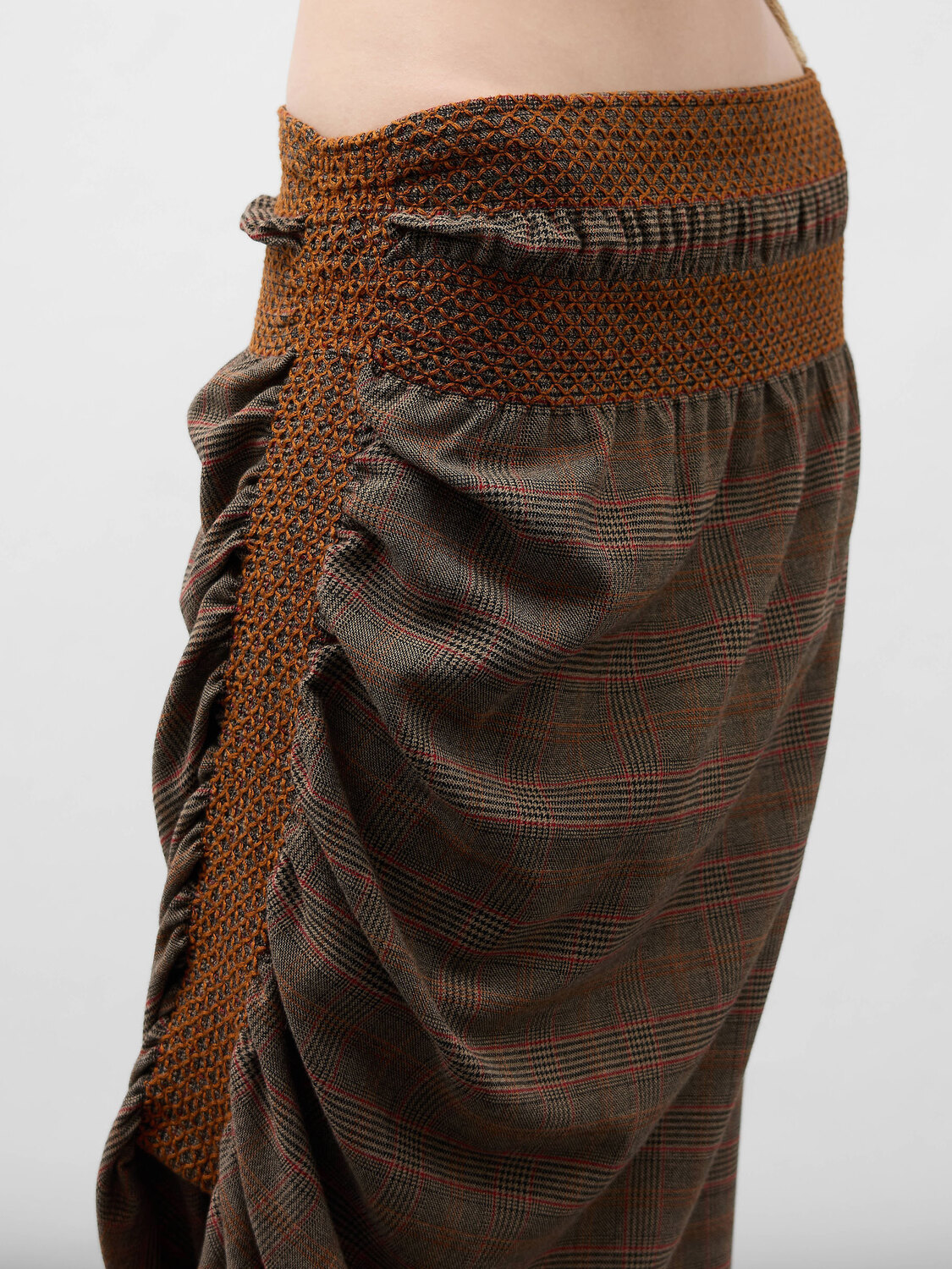 E-Play khaki tartan asymmetrical skirt featuring elasticated decorative elements with brown embroidery and gathered details at the waist and right side.