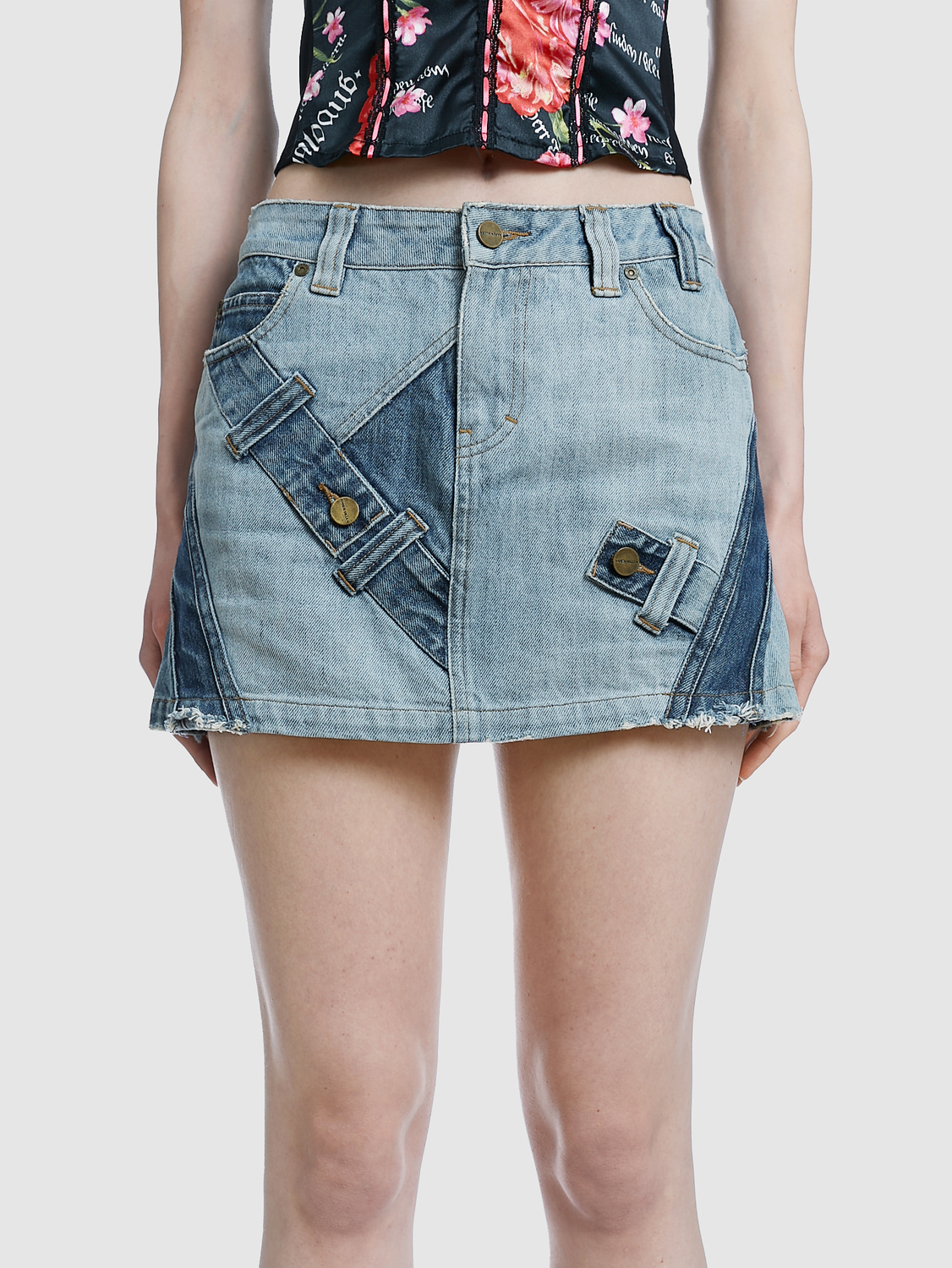 Karen Millen deconstructed denim mini skirt in different washes. Two pockets on the front, one on the back. Brass coloured decorative hardware.