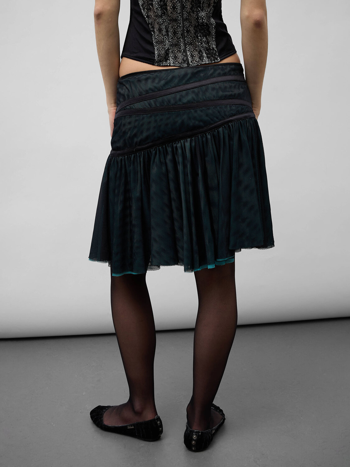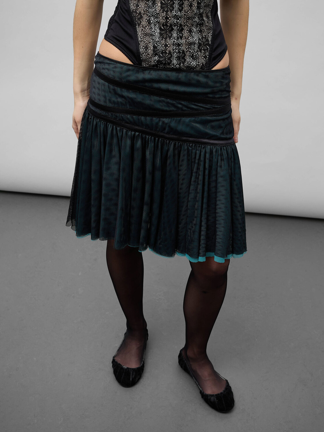 Ruffled mini skirt featuring multiple layers of turquoise and black mesh, elasticated waist.