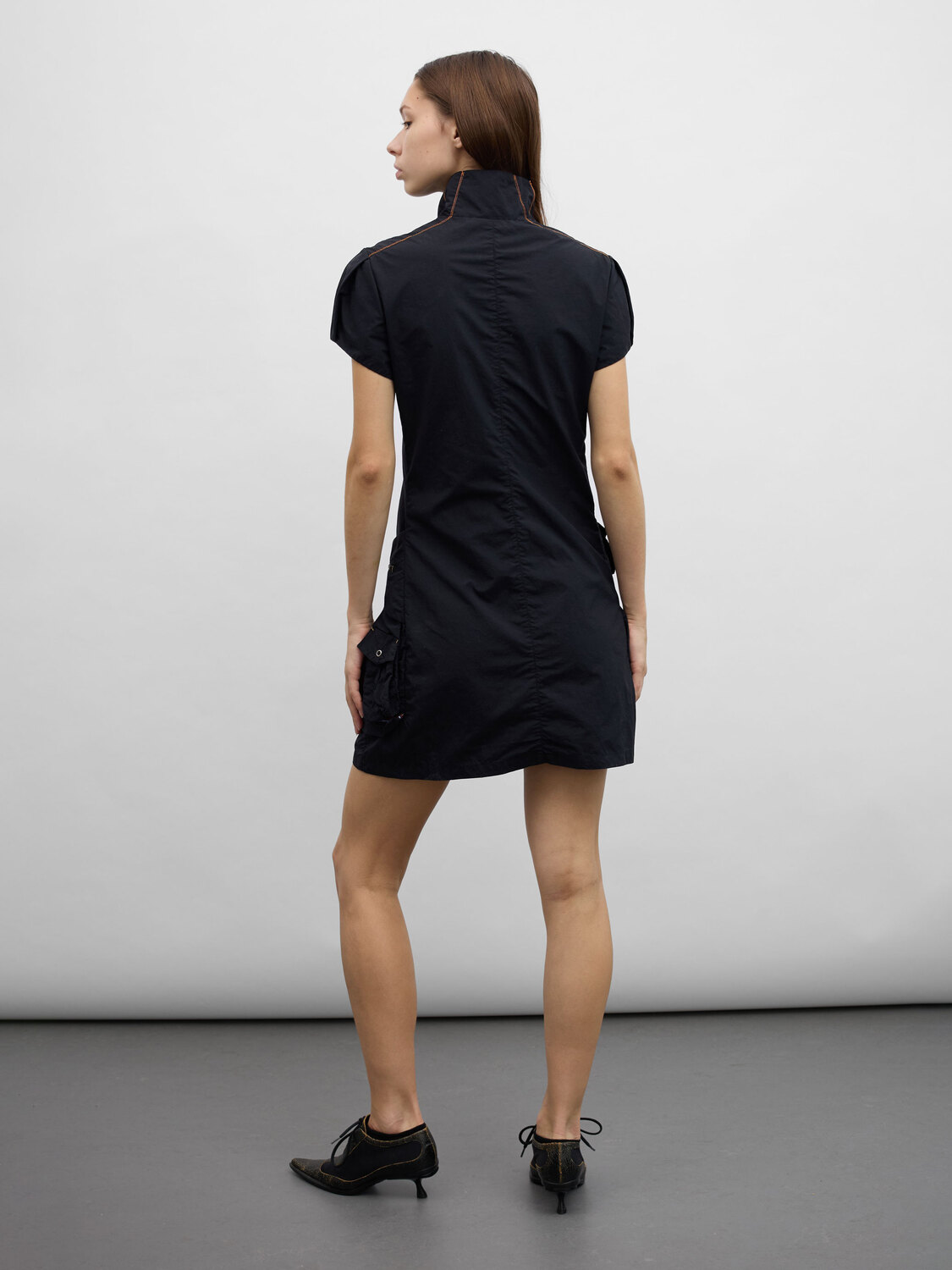 Black zip-up cargo mini dress with gathered details, multiple pockets and an integrated utility-style belt.