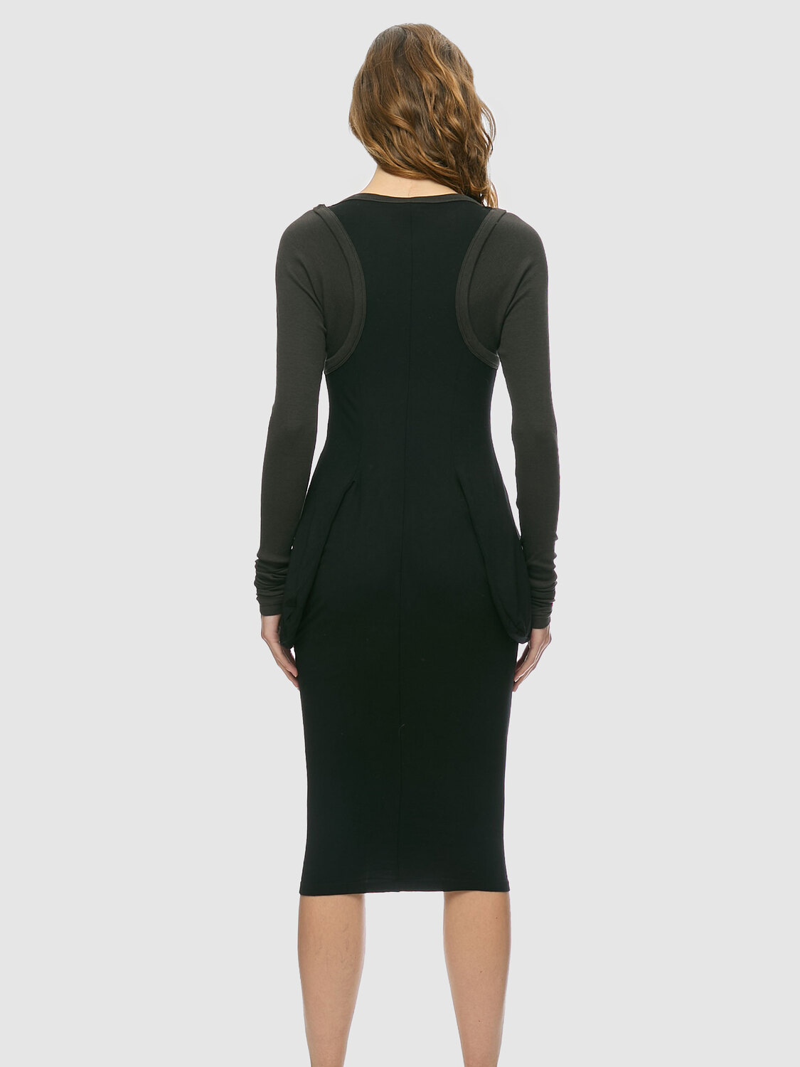 Cop Copine back and grey racer back midi dress with an integrated rib jersey longlseeve t-shirt, zipper closure at the front and decorative inside out pockets.