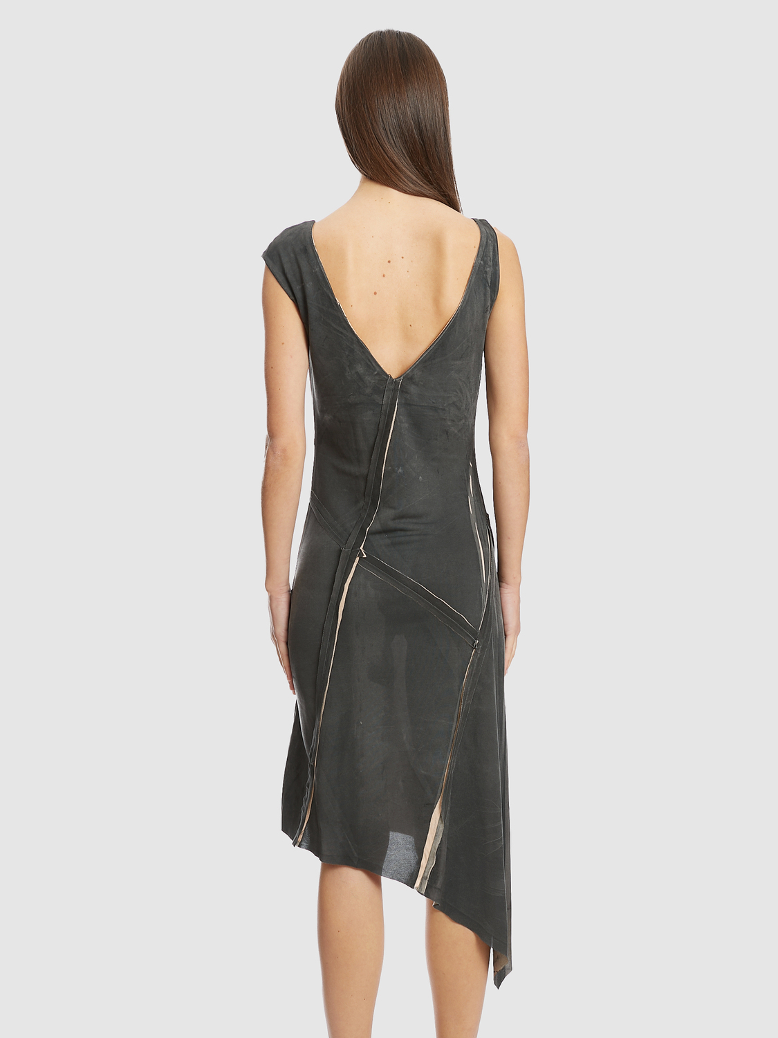 Grey and pink asymmetrical deconstructed sleeveless midi dress with faded effect.