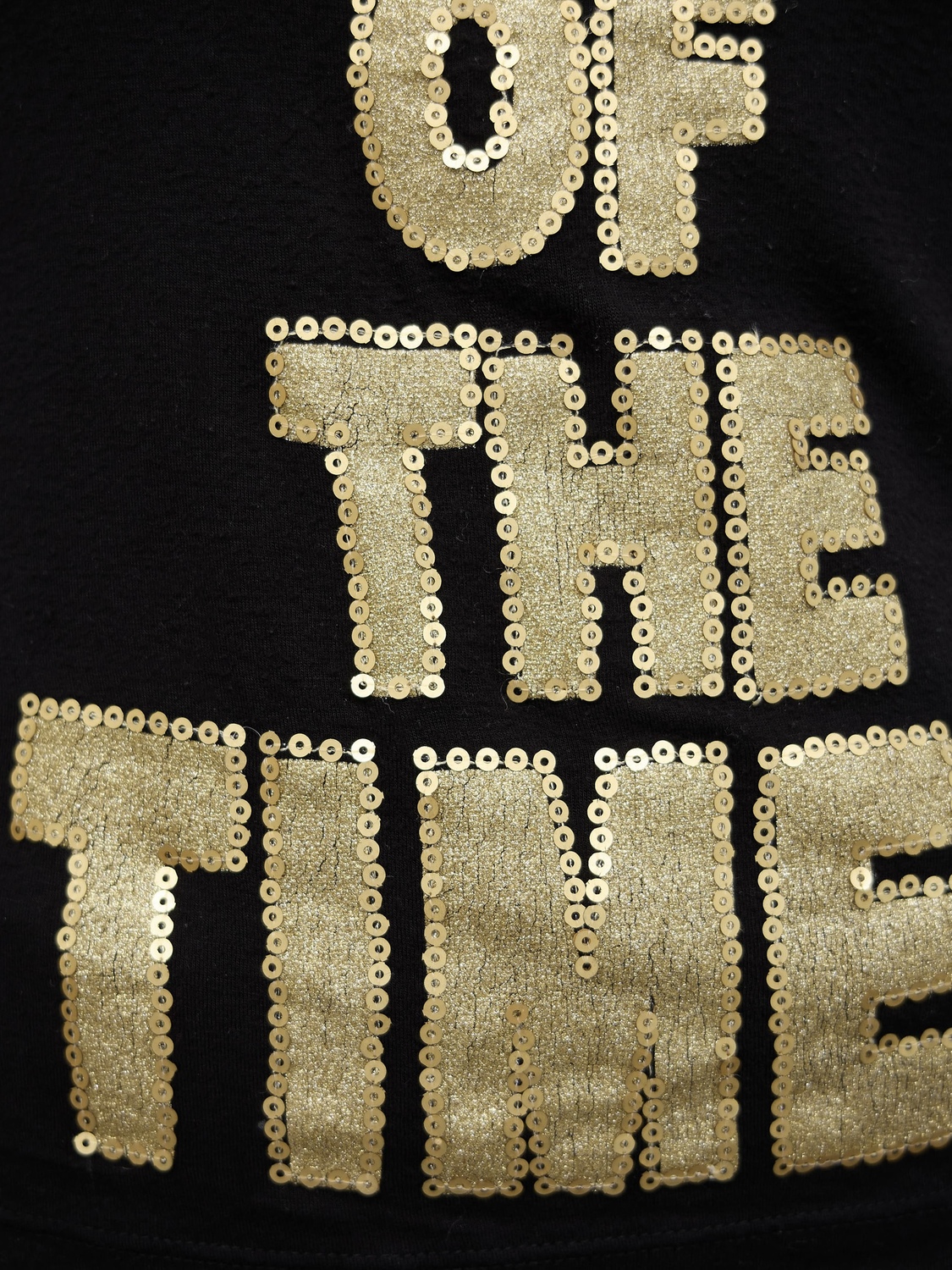 Dolce & Gabbana black and gold camisole top with a glittery sequin-embellished 'I'm ahead of times' slogan print.