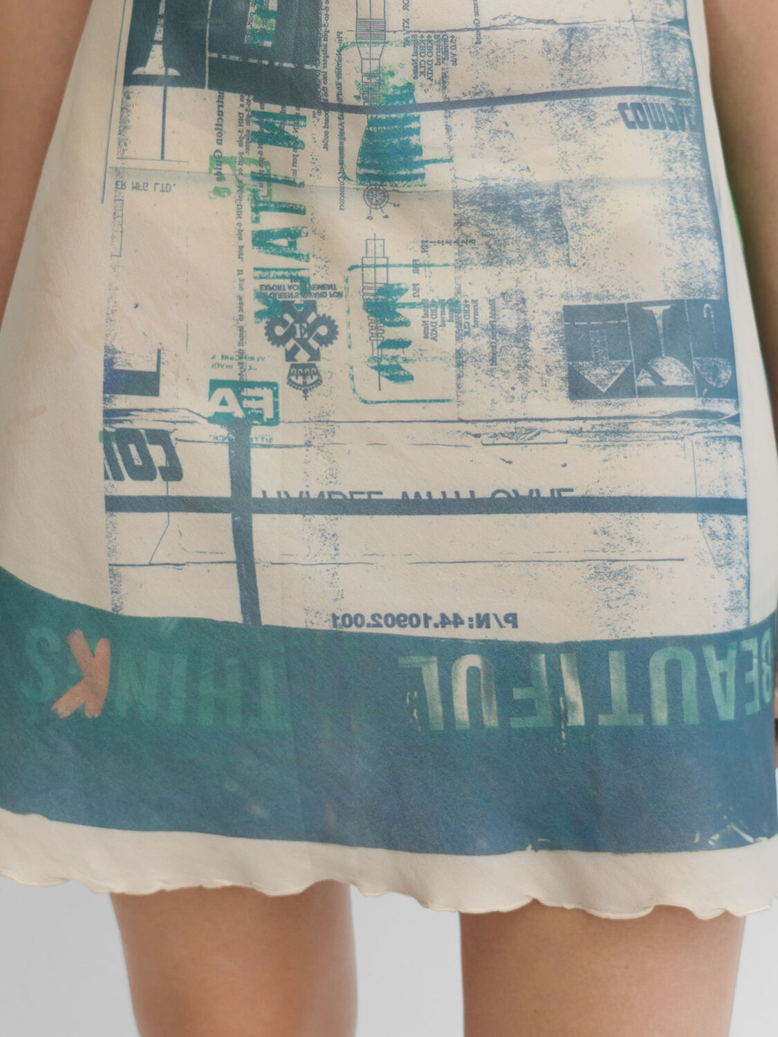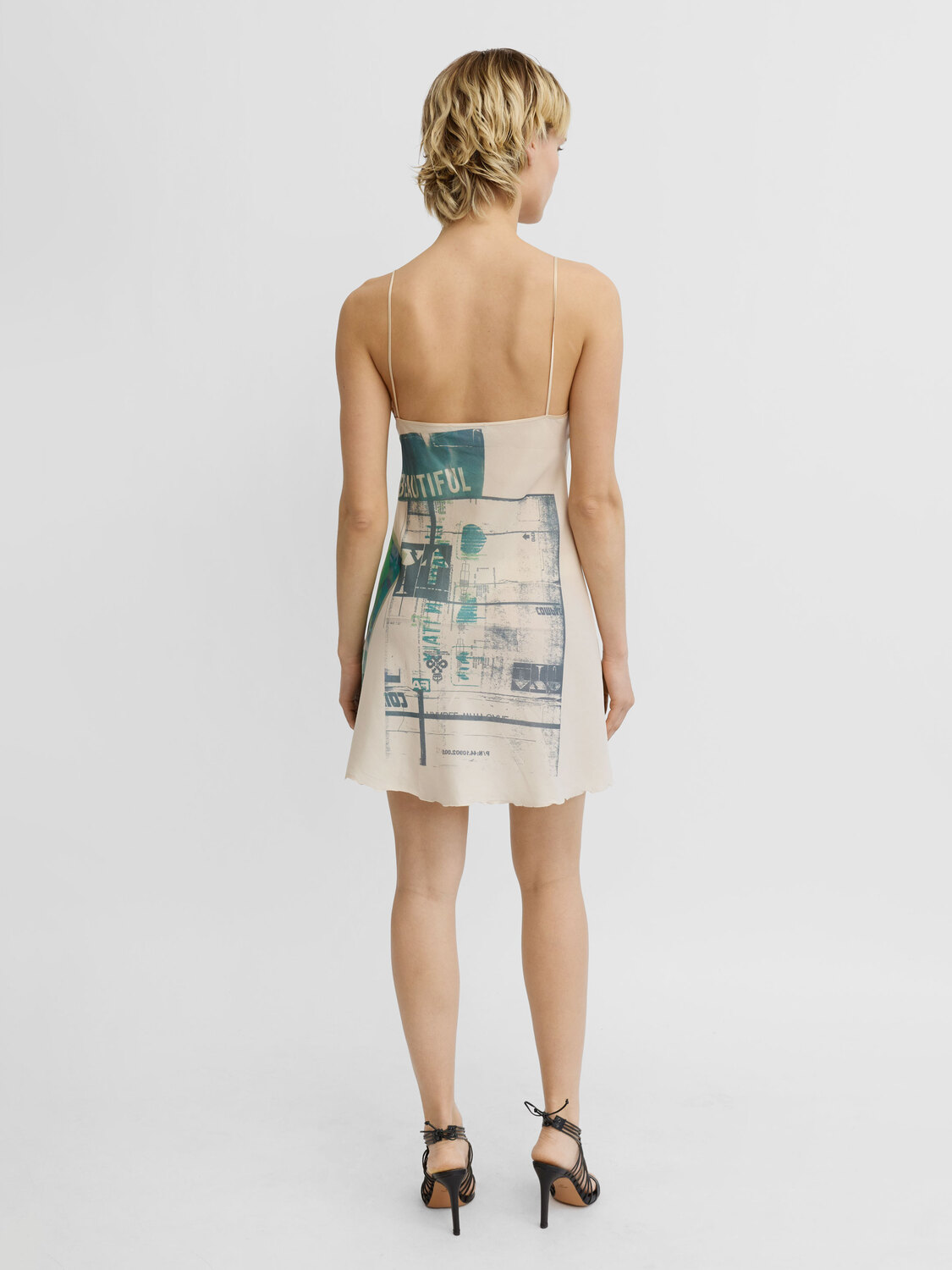 E-play champagne color satin slip dress with a graphic photo print on the front and back.