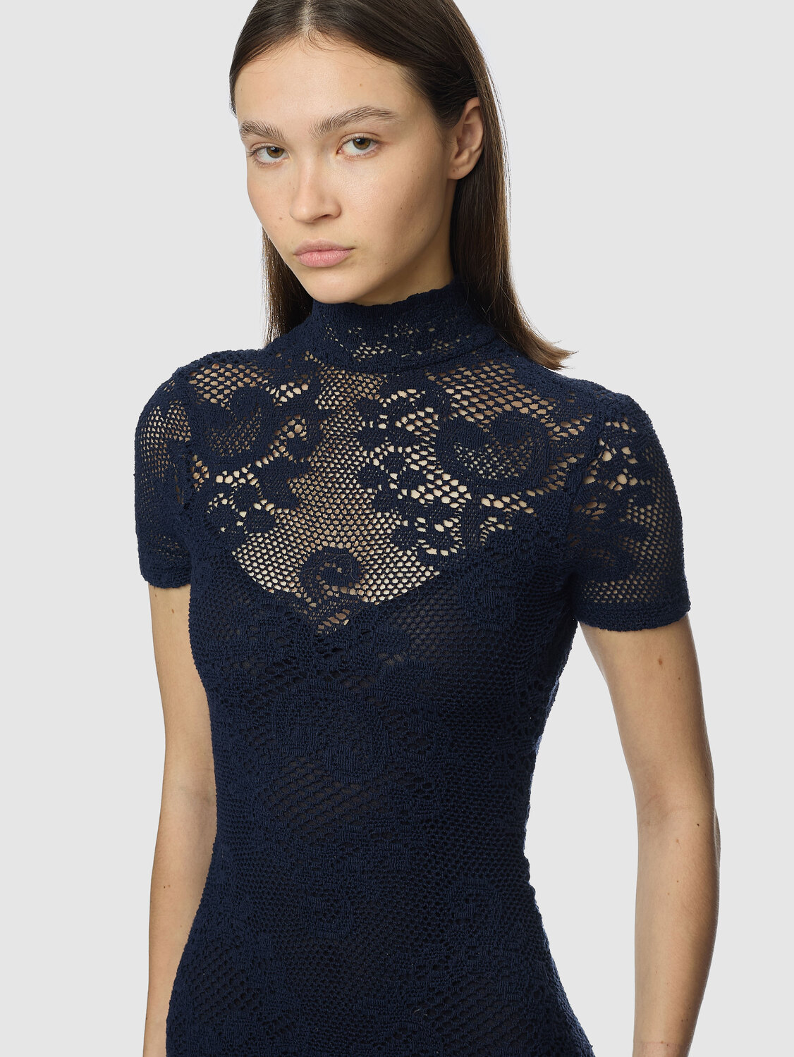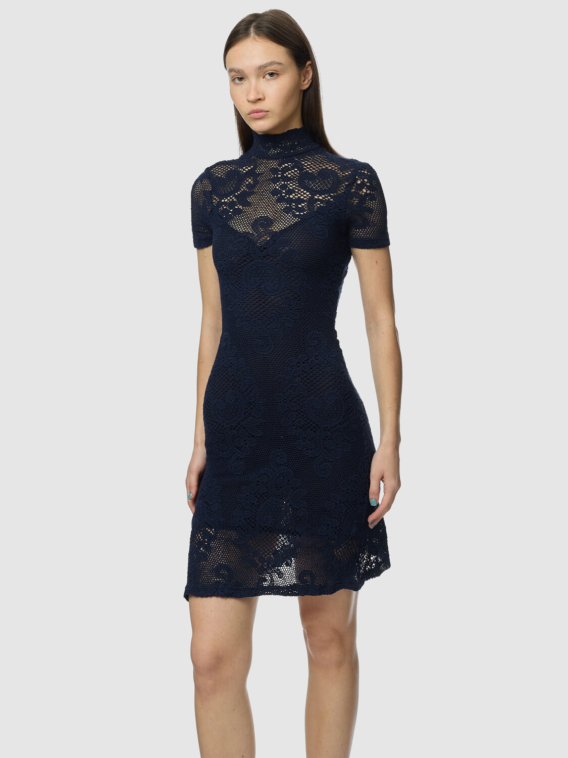 Navy blue cotton lace stretchy short-sleeve mini dress with mesh lining, button closure and open back.