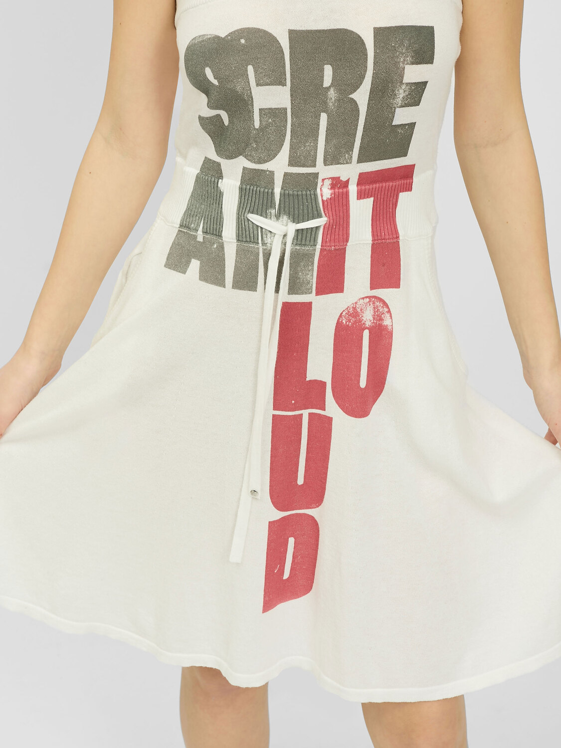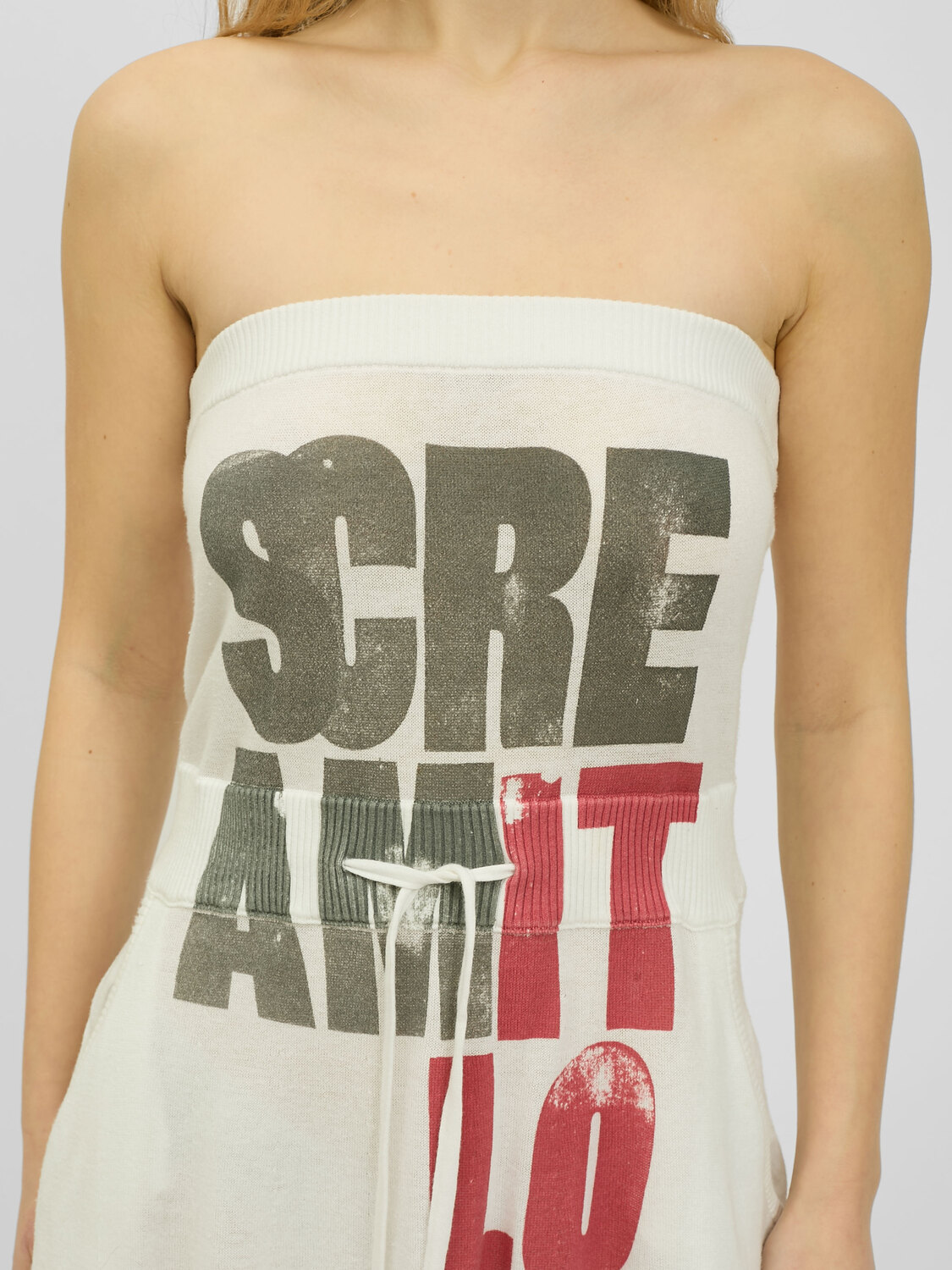 Nolita white knitted strapless dress with a “Scream It Loud” print, pockets and drawstrings.