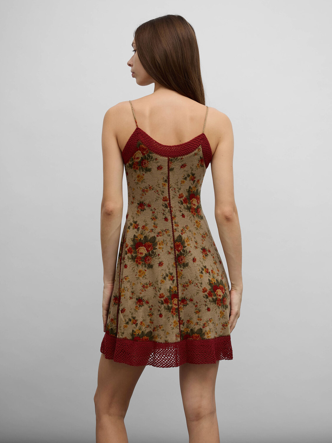 Plein Sud multicolour knit mini dress with a floral print and crochet trim. Button closure. Bronze satin lining.