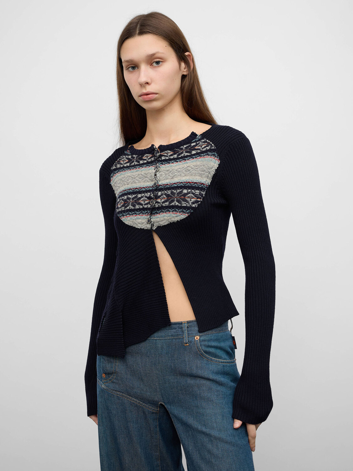 Marithé+François Girbaud black wool knitted cardigan with a large pattern patchwork detail in the middle and an asymmetrical hem.