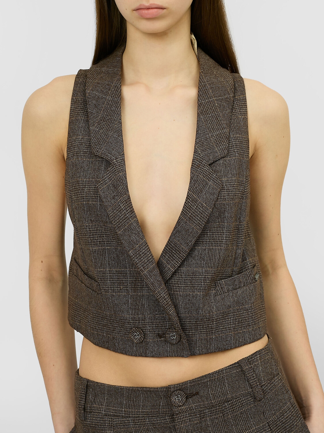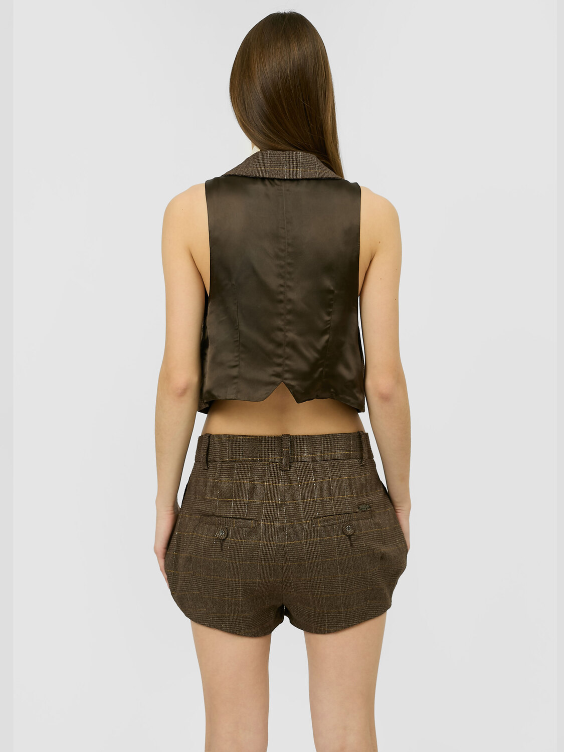 Killah oversized vest and shorts set in brown checkered material with gold and silver lines.