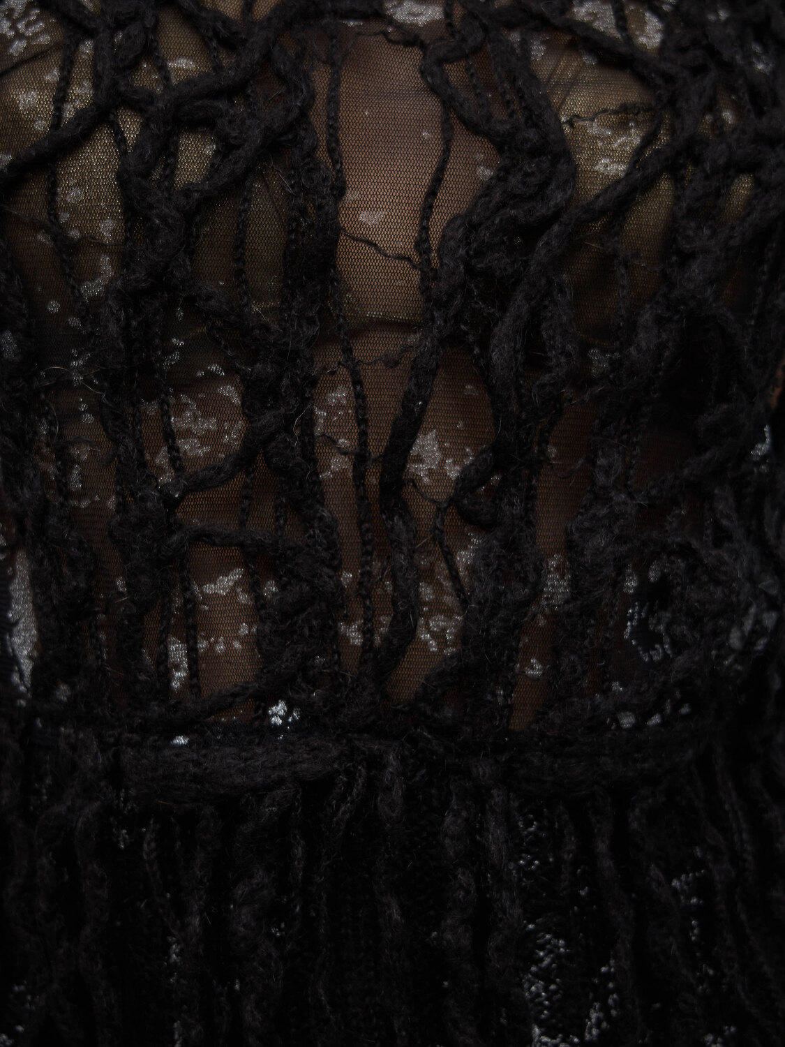 Black knitted turtleneck vest featuring a mesh front panel with paint stain effect print and intertwined fringes.